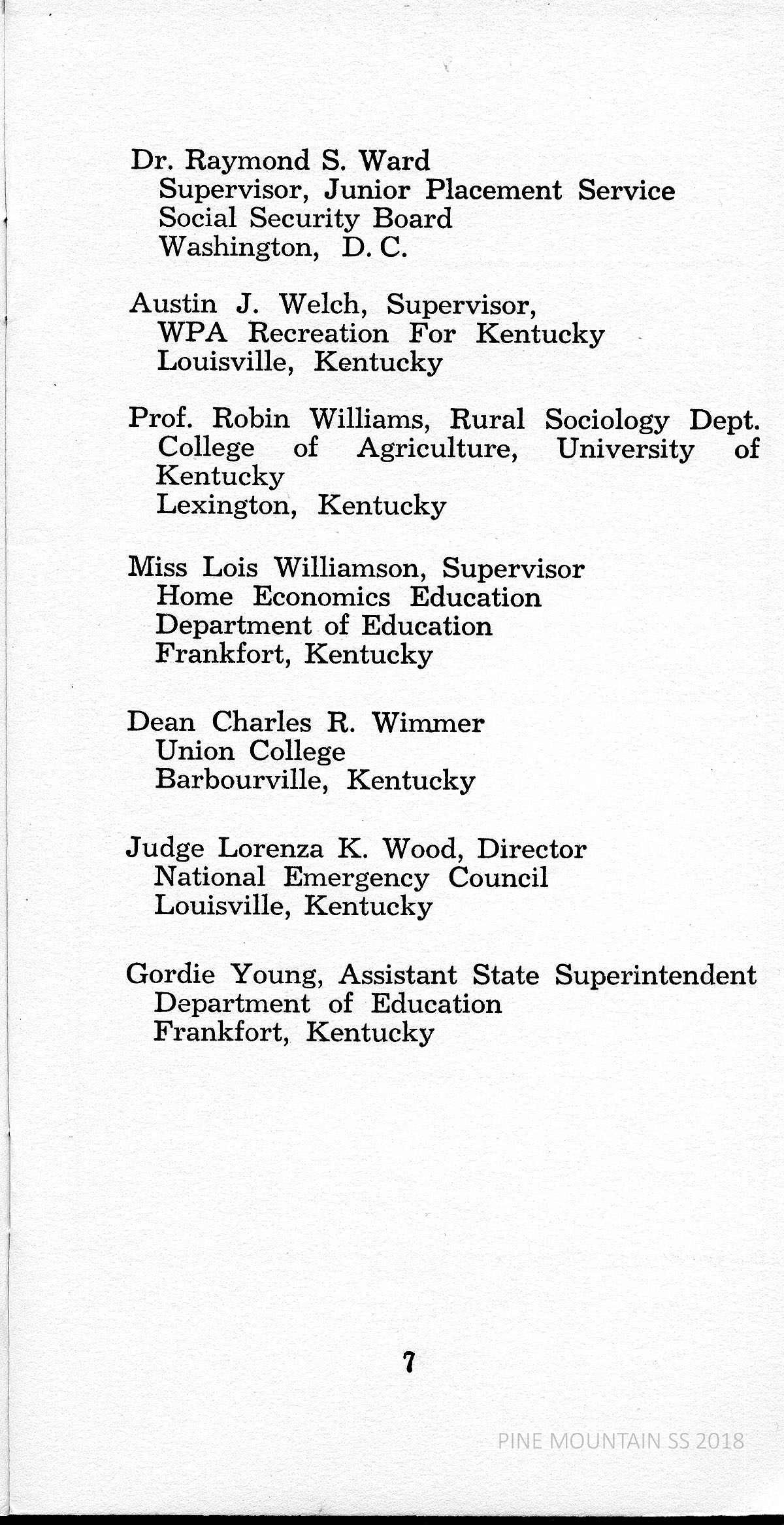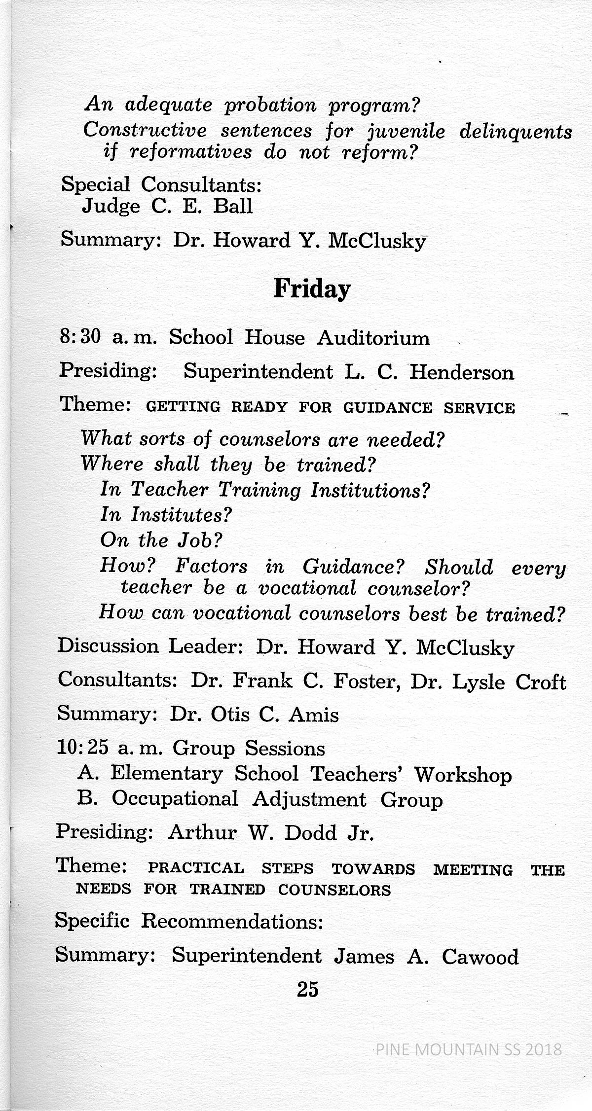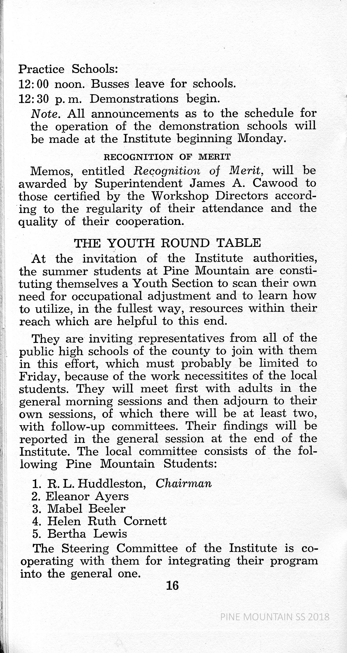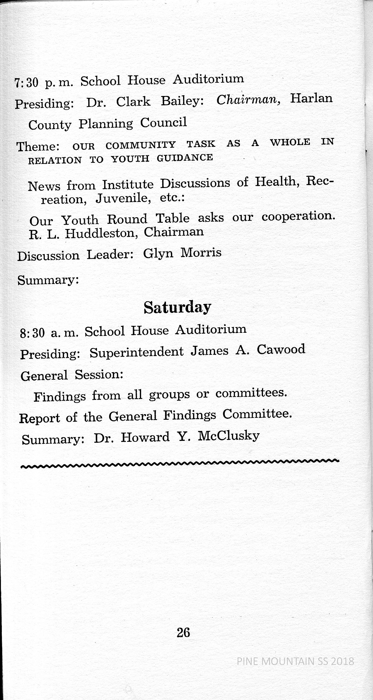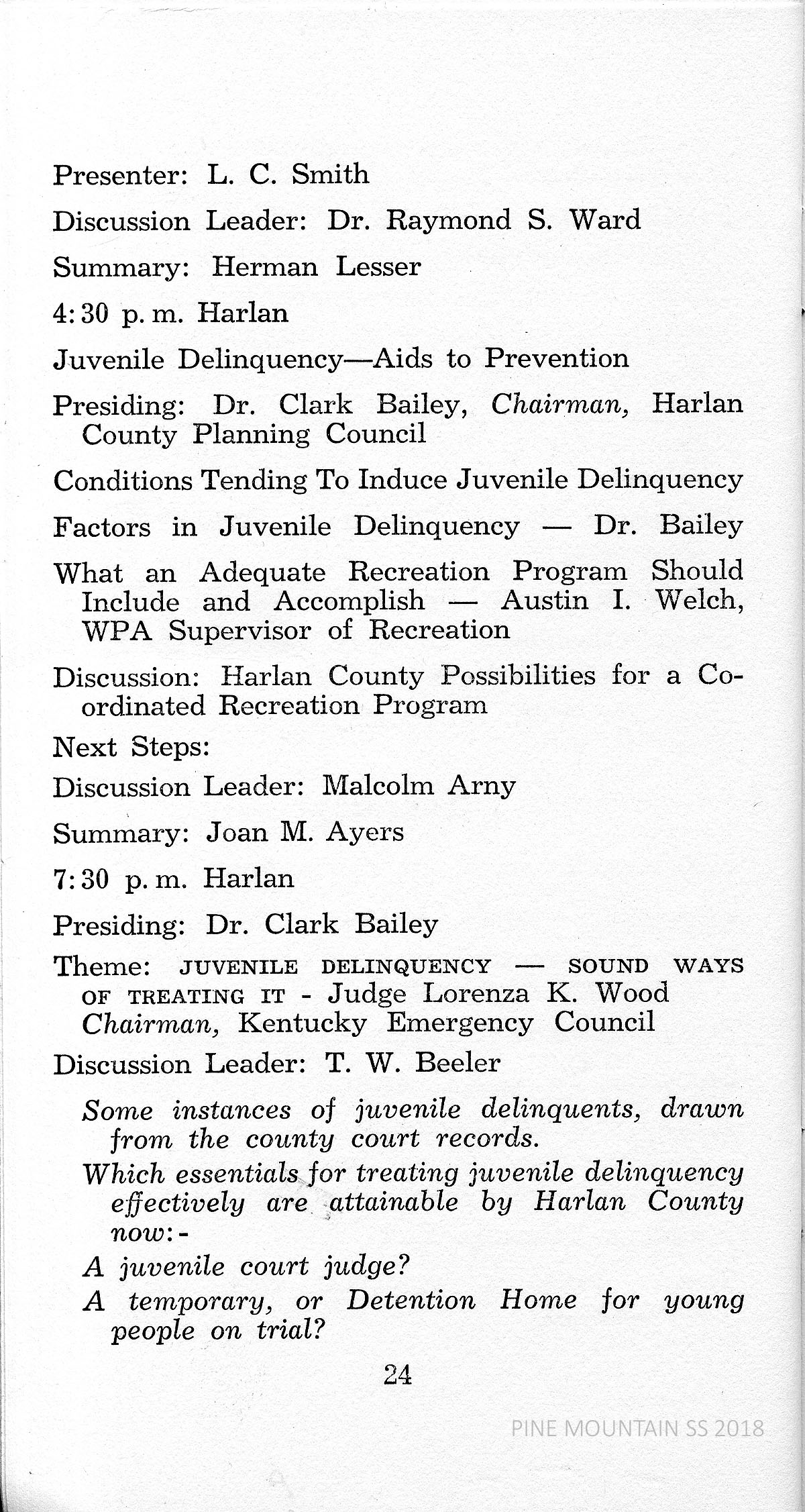 The 1940 PINE MOUNTAIN RURAL YOUTH GUIDANCE INSTITUTE was the fourth annual week-long meeting of Harlan County teachers, parents, ministers and other youth leaders. It was held at the Pine Mountain Settlement School where most of the earlier meetings had been located. The Alliance for Guidance of Rural Youth of Richmond, Virginia, sponsored the meeting.