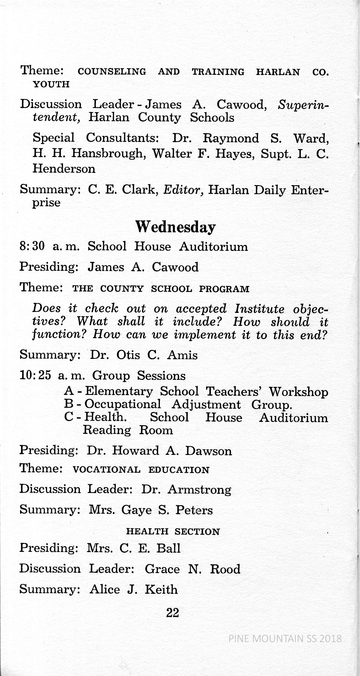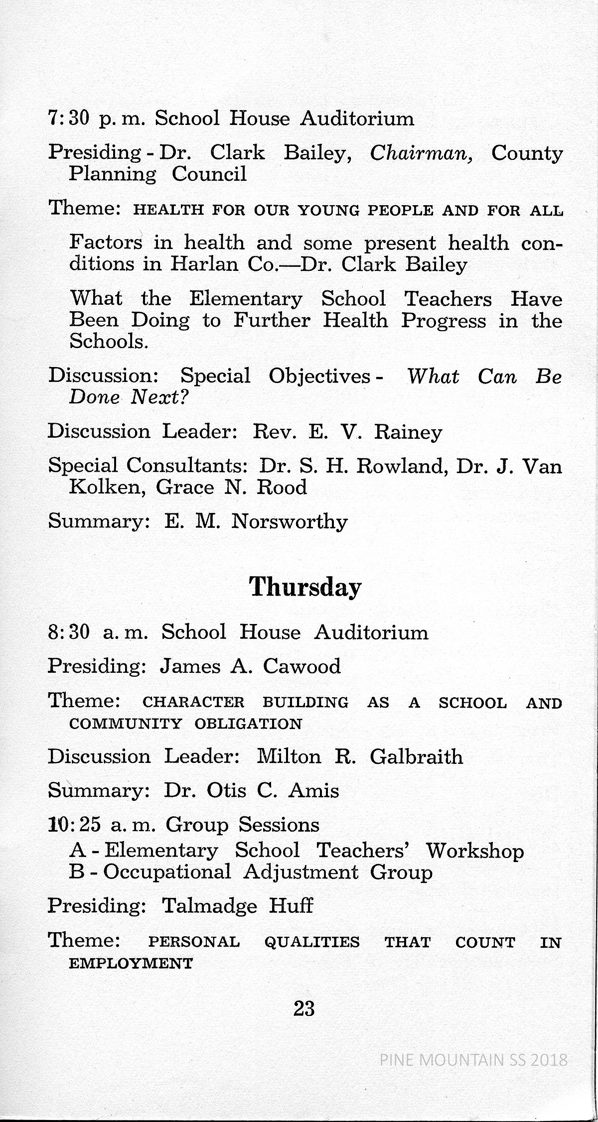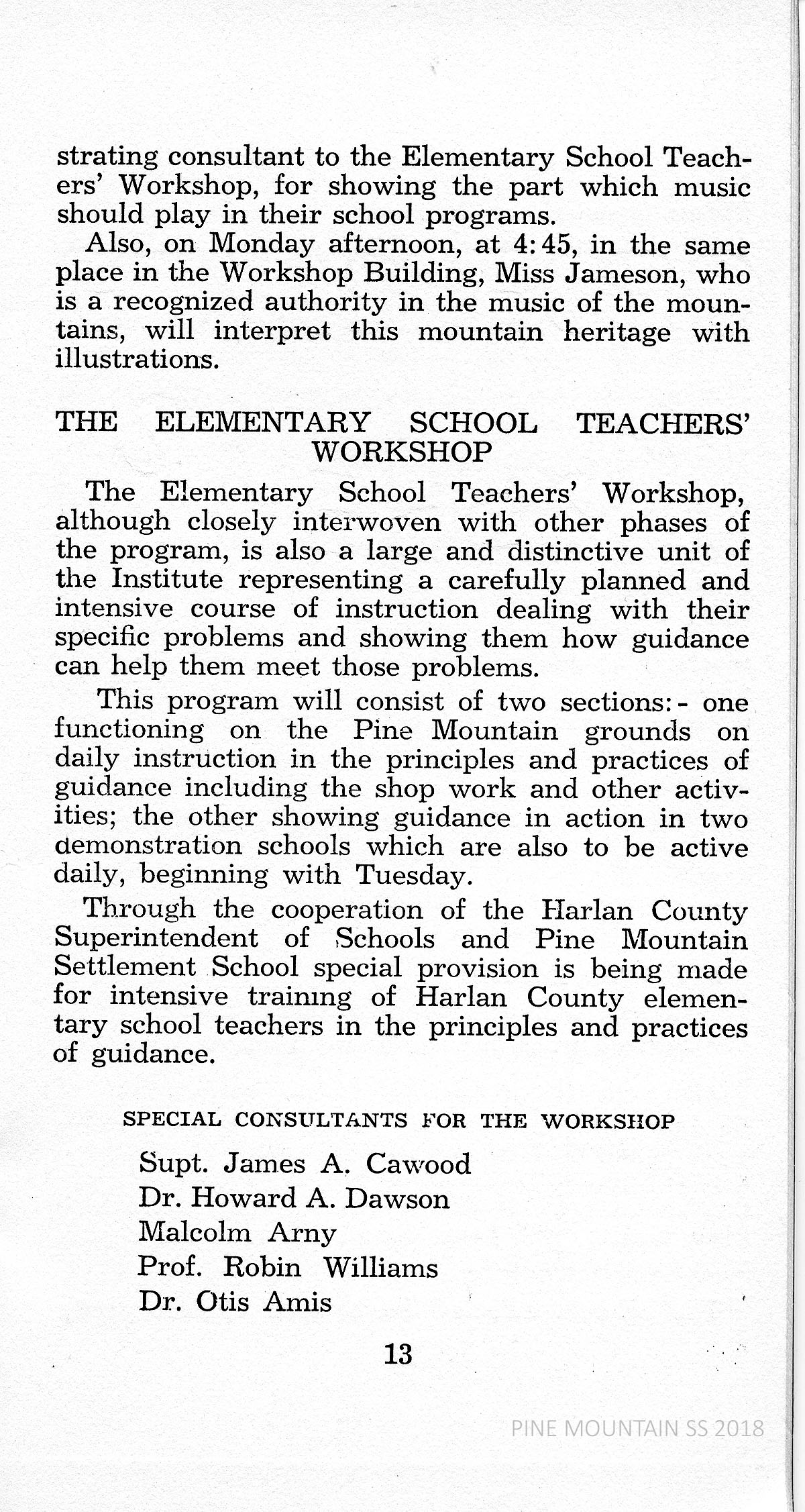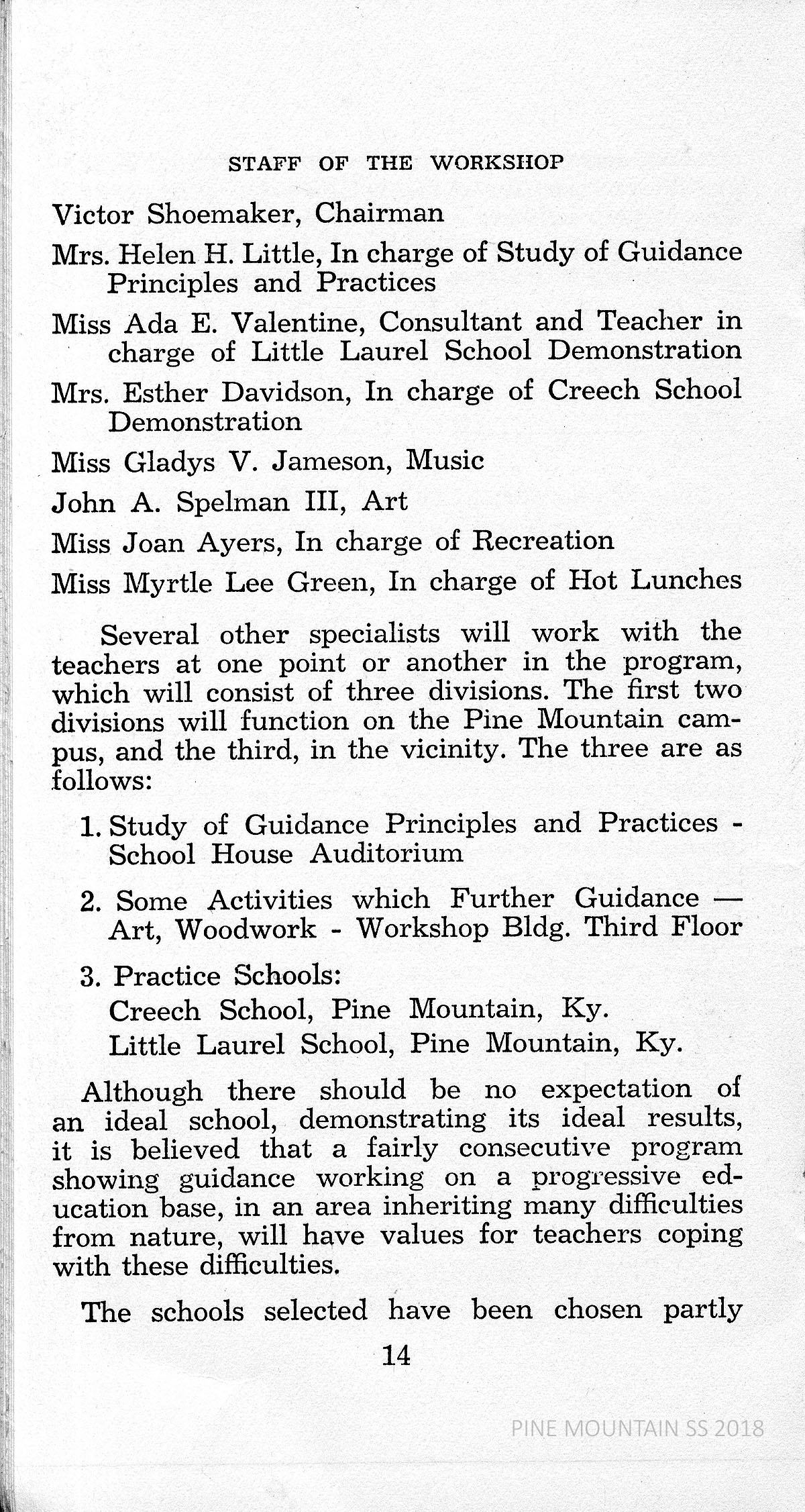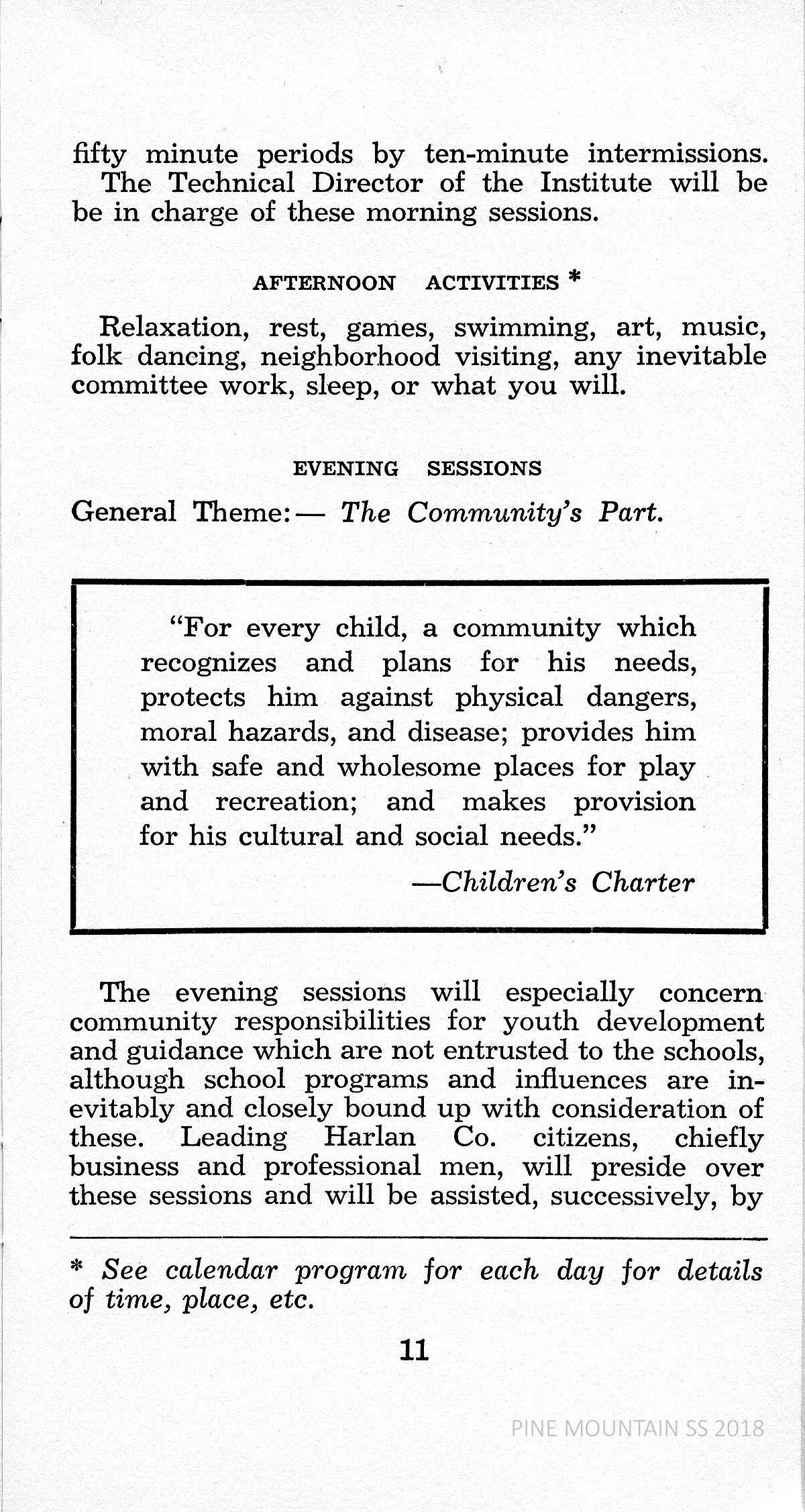 The 1940 PINE MOUNTAIN RURAL YOUTH GUIDANCE INSTITUTE was the fourth annual week-long meeting of Harlan County teachers, parents, ministers and other youth leaders. It was held at the Pine Mountain Settlement School where most of the earlier meetings had been located. The Alliance for Guidance of Rural Youth of Richmond, Virginia, sponsored the meeting.