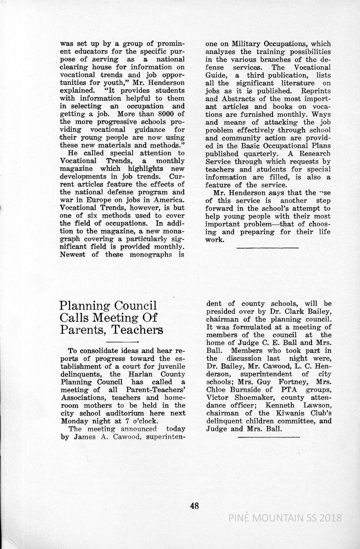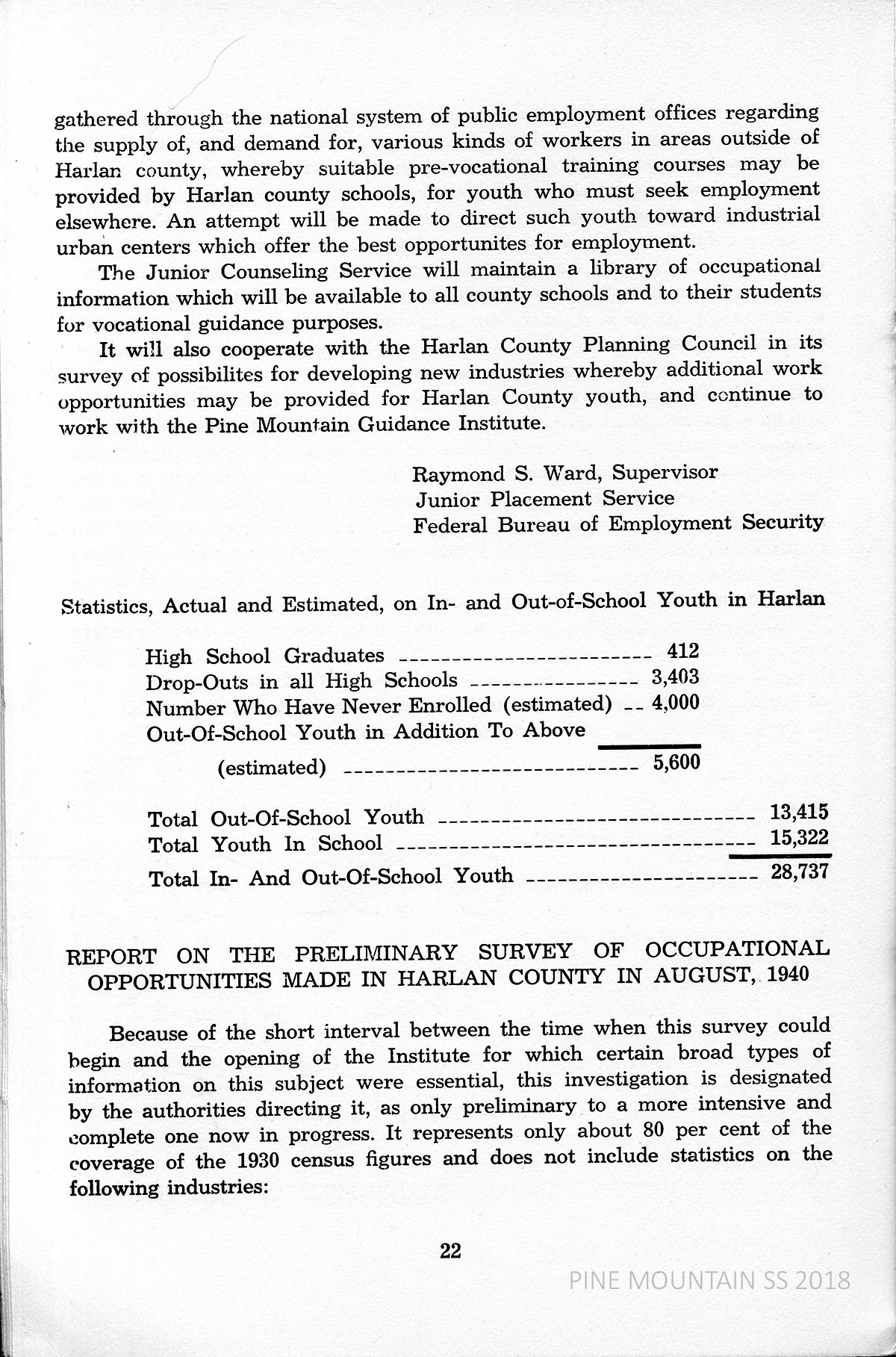 TAGS: 1940 Rural Youth Guidance Institute Findings; Harlan County, Kentucky; Pine Mountain Settlement School; Glyn Morris; Harlan County Superintendent of Schools; youth guidance; rural schools; educational guidance; James A. Cawood; O. Latham Hatcher; Alliance for Guidance of Rural Youth;