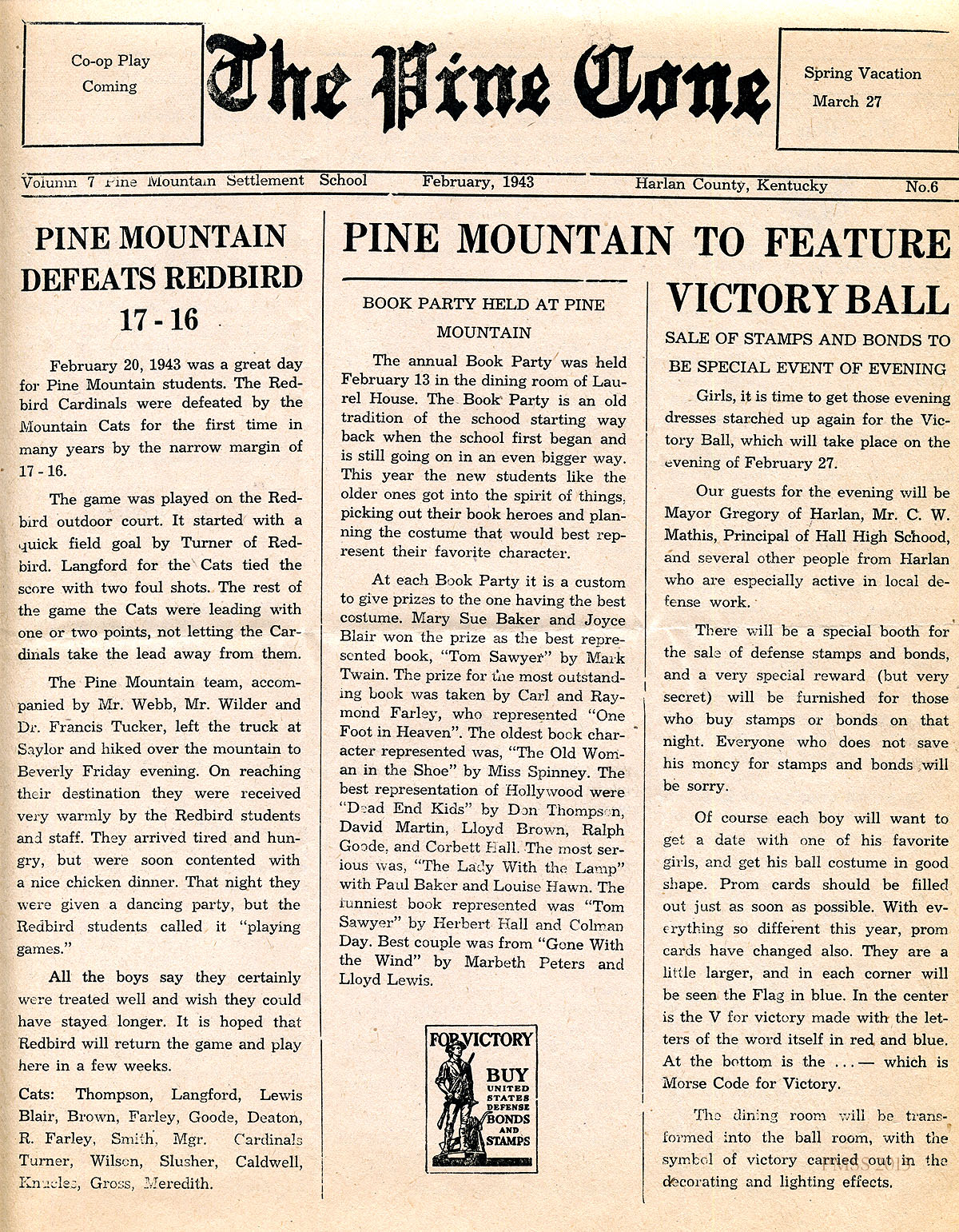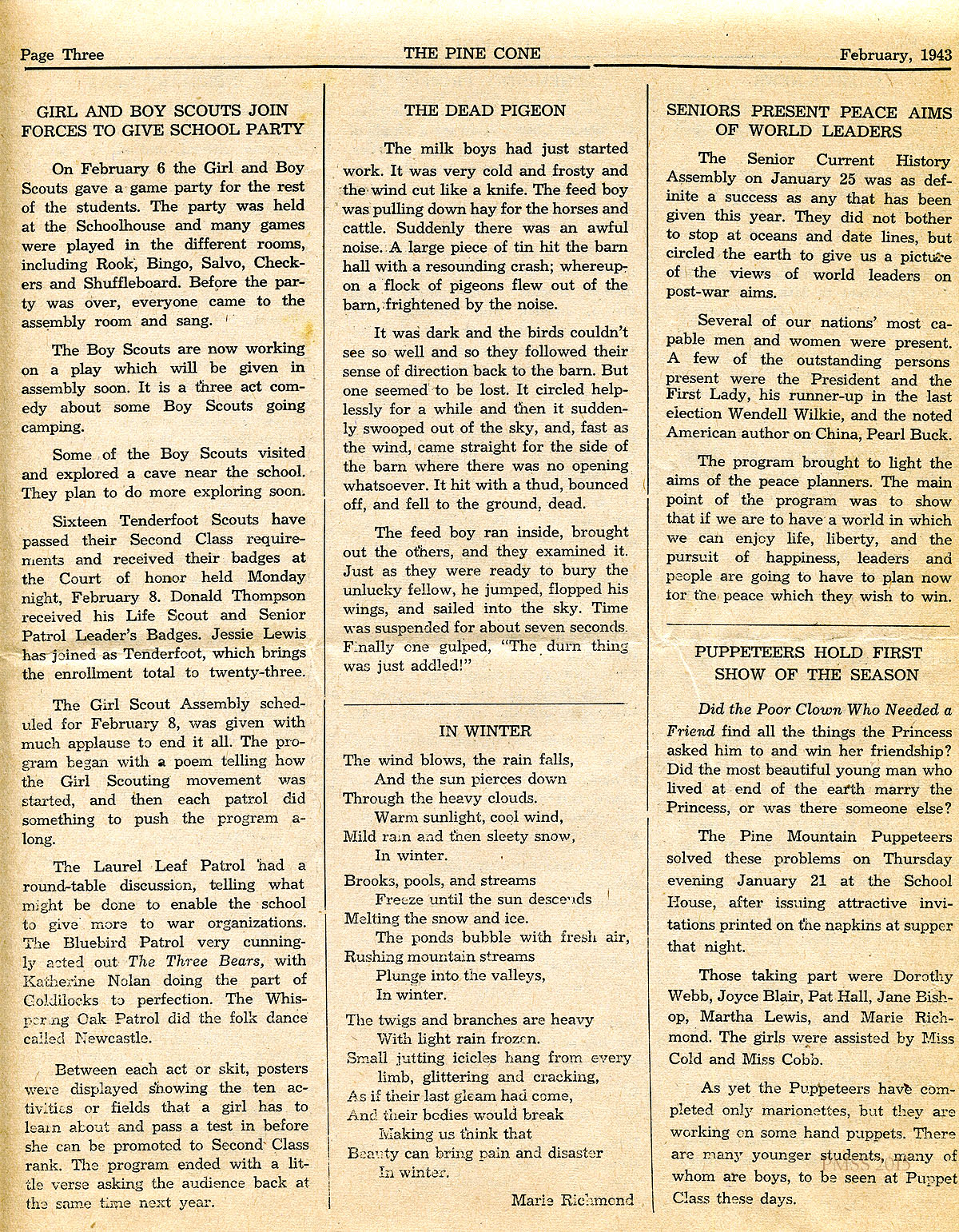 TAGS: The Pine Cone 1943 February, student writings, Victory Ball, softball, book party, editorials, Boy Scouts, Girl Scouts, poems, puppeteers, campus news