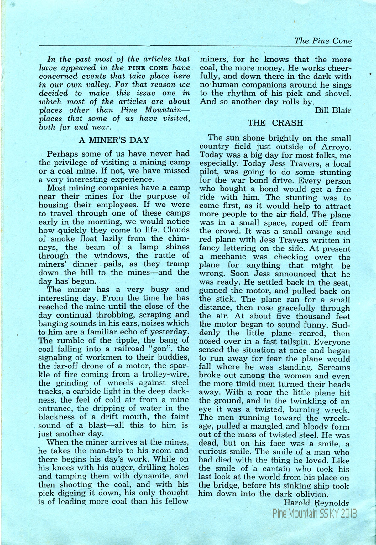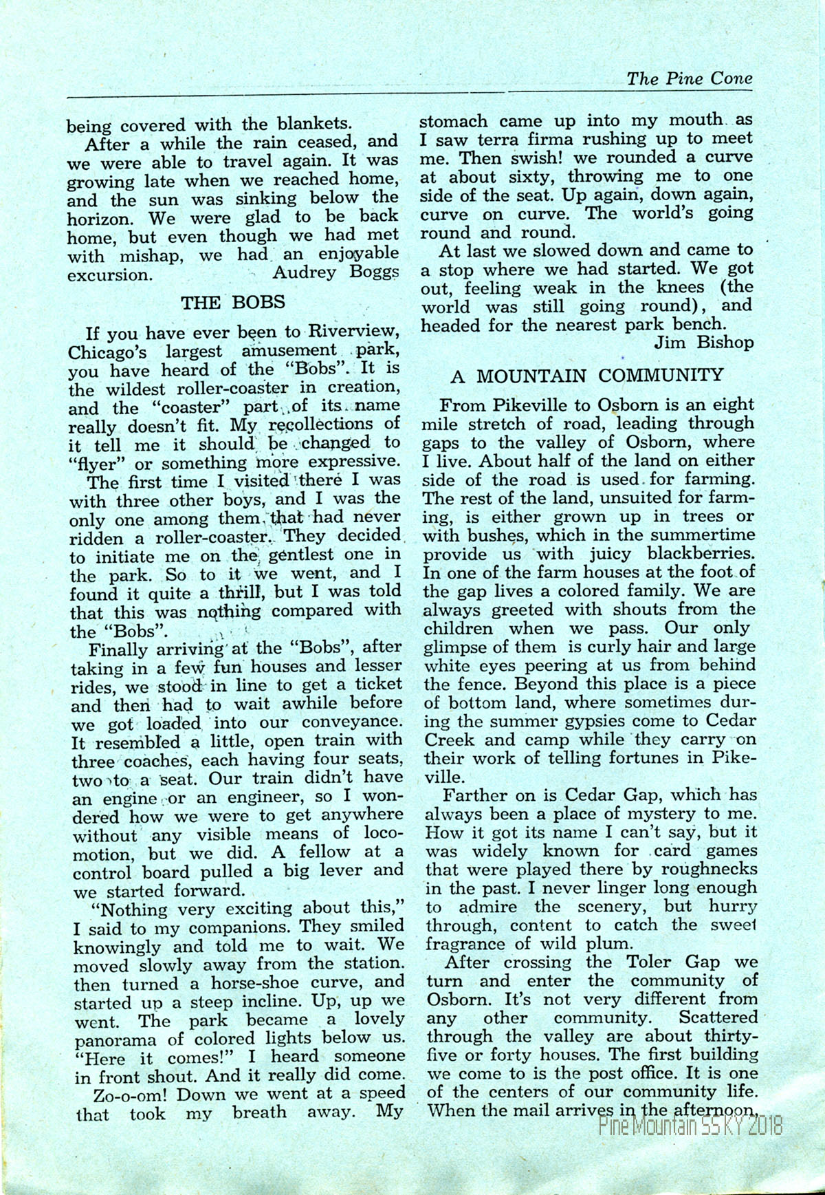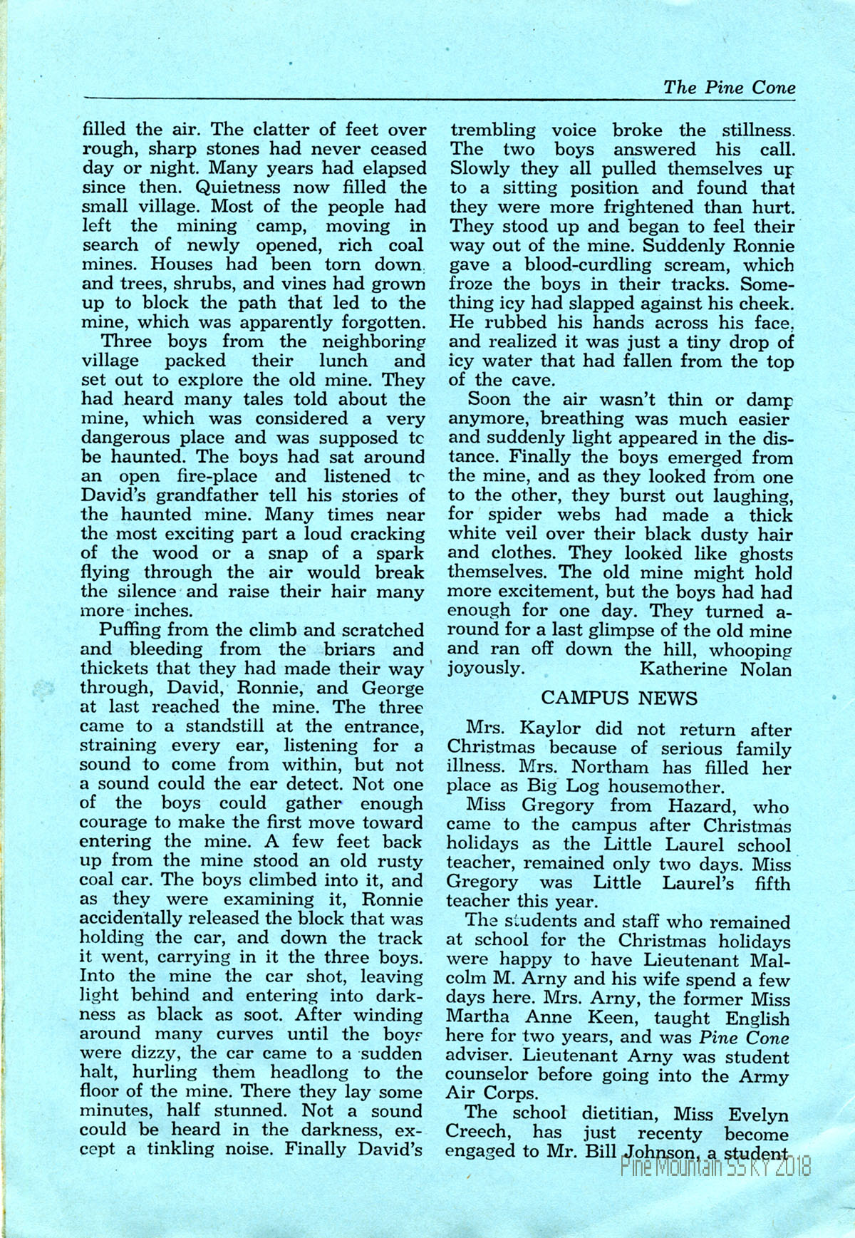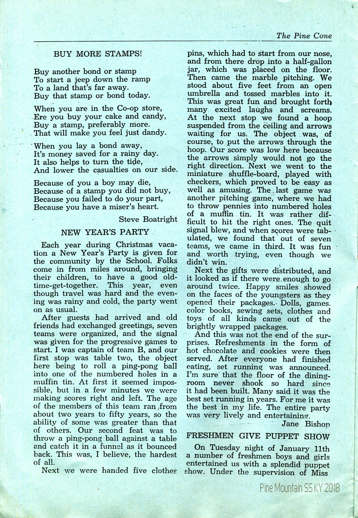 “The Pine Cone is the paper of Pine Mountain School. Everyone as a member of Pine Mountain School is responsible for its welfare. The editorial staff will appreciate contributions you have to make.”