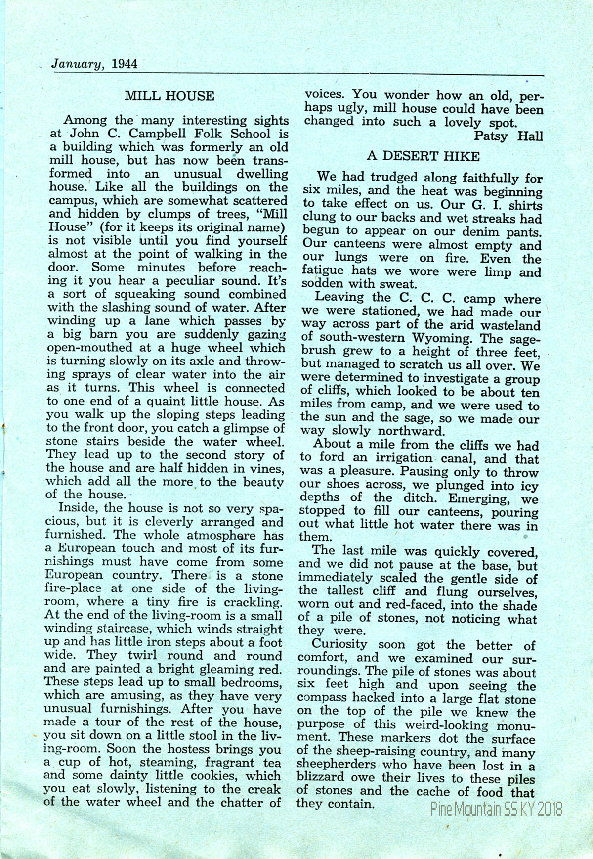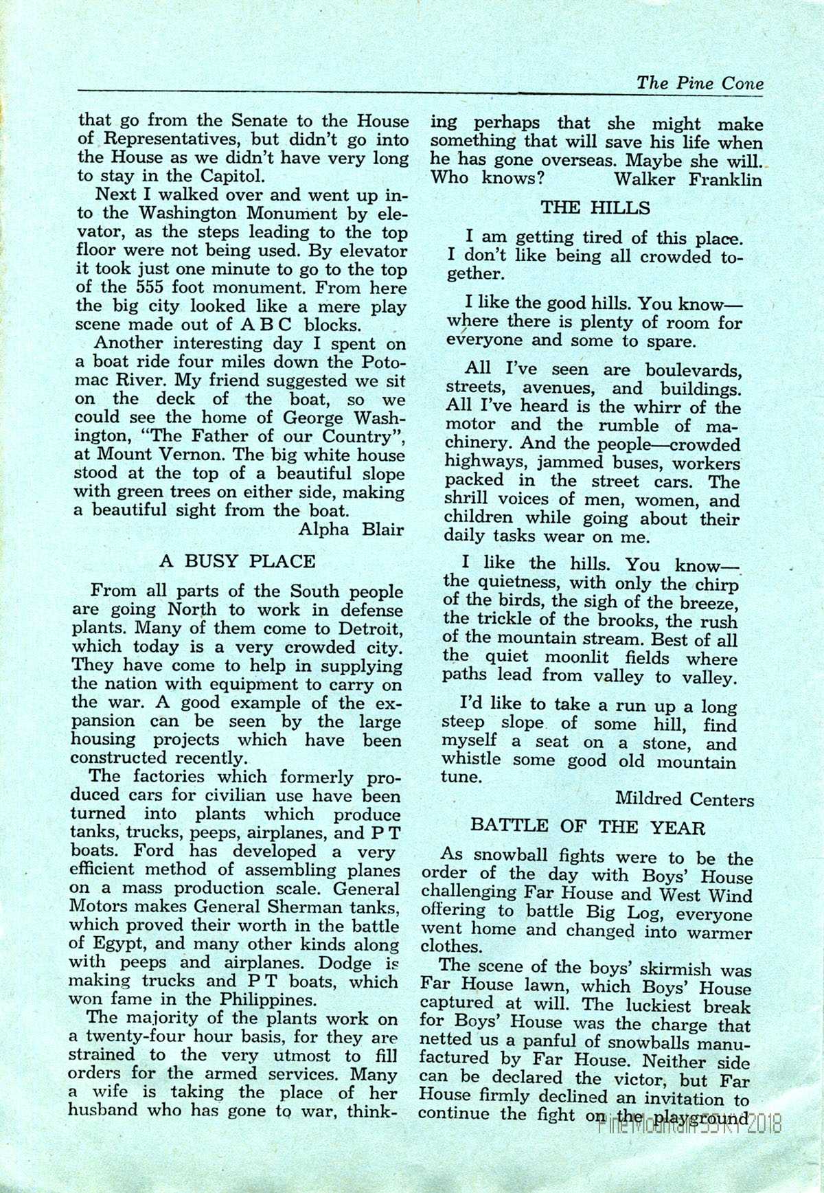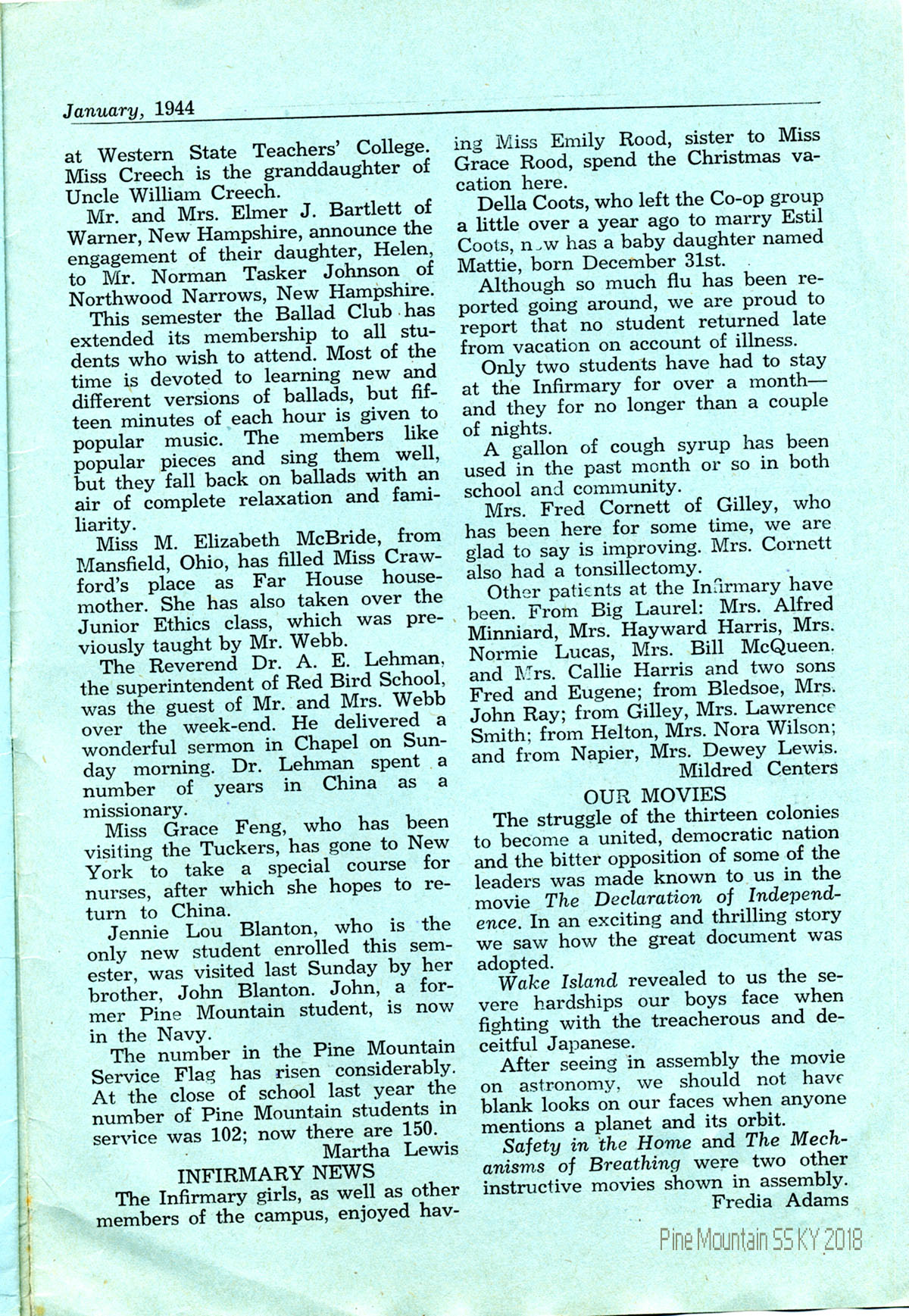 “CAMPUS NEWS” by Martha Lewis – Mrs. Kaylor, Mrs. Northam, Miss Gregory, Lt. Malcolm M. Arny, Martha Anne (Keen) Arny, Miss Evelyn Creech, Bill Johnson, Helen Bartlett, the Ballad Club, Miss M. Elizabeth McBride, Miss Crawford, Mr. [William] Webb, Grace Feng, Jennie Lou Blanton; currently 140 Pine Mountain students are in service.