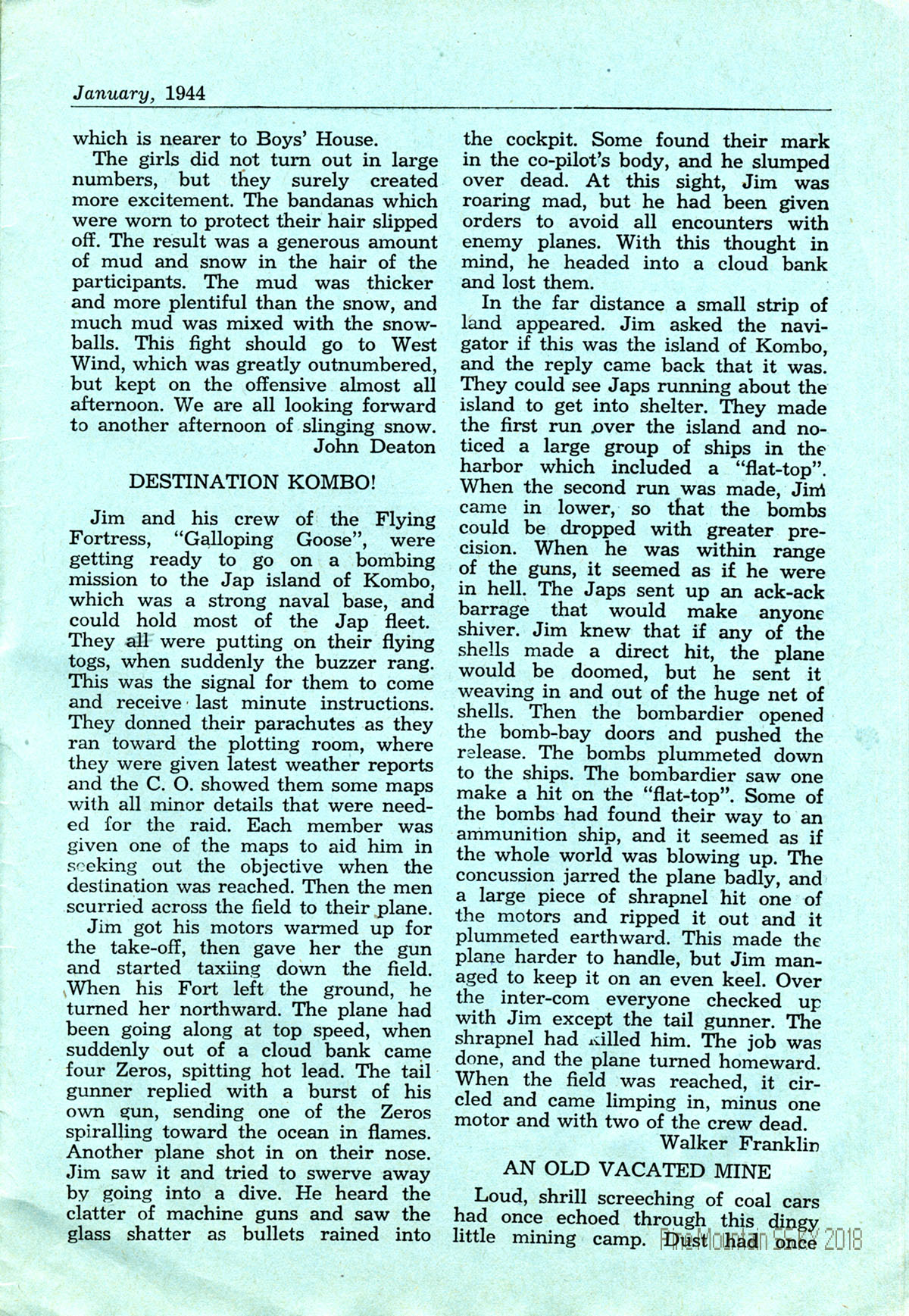 “DESTINATION KOMBO!” by Walker Franklin – Describes a bombing mission to the Japanese island of Kombo.
