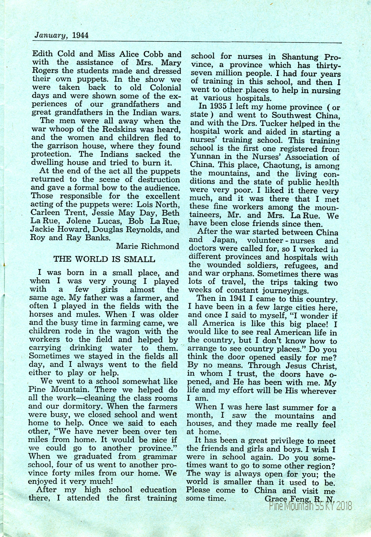 “THE WORLD IS SMALL” BY Grace Feng, R.N. – Describes her growing up in China, working with Drs. [Emma and Frances] Tucker and Mr. and Mrs. LaRue, 1930s – early 1940s.
