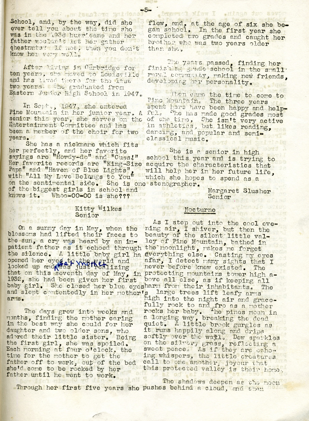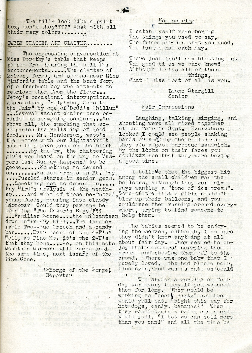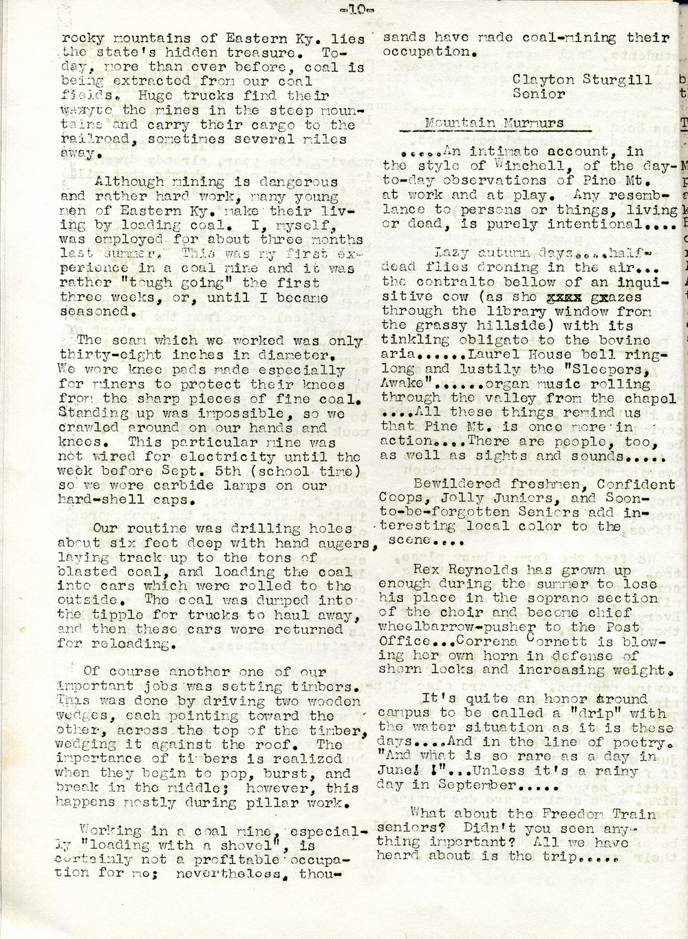 “Lest We Forget,” by Arles Centers. Reviews lives of former students: Raymond Sturgill at Berea; Margaret Blair at home in Whitesburg; Hobart Wilder staff member at PMSS; Owen Lewis at home in Pine Mountain valley; Ida Mae Lewis working as a pastry chef in Lewellen Hotel in Harlan; Birdie Tipton at home in Twila; Melvin Coots works in lumber yard in London, KY; Mary Garrett is employed at Harlan Hospital and living at Bledsoe; Betty Huff just married to Gordon Nichols, minister, now in New York; Charline Lewis is teaching school in Evarts; Alberta Turner is teaching school at Alex Branch near Big Laurel, KY; Clela Sergent is attending Union College in Barbourville, KY; Jan Burkhart is a clerk in Harlan store; Ann Metcalf is at home in Loyall, KY; Mary Ruth Bird is waitress in Wallins, KY.