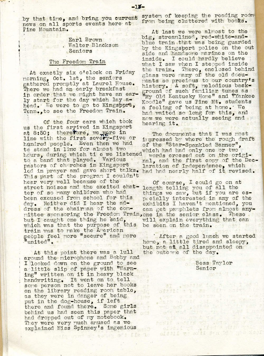 “The Freedom Train” by Bess Taylor, Senior – PMSS students travel to Kingsport, TN, and stand in line to see the Freedom Train which contained historical U.S. documents; anecdote about Miss Spinney.