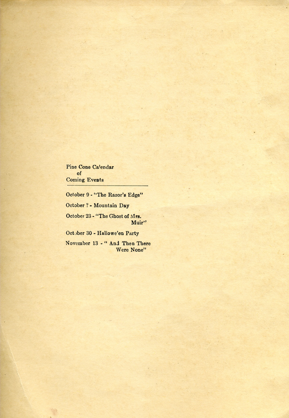 “Pine Cone Calendar of Coming Events”: “The Razor’s Edge,” Mountain Day, “The Ghost of Mrs. Muir,” Halloween Party, “And Then There Were None.”