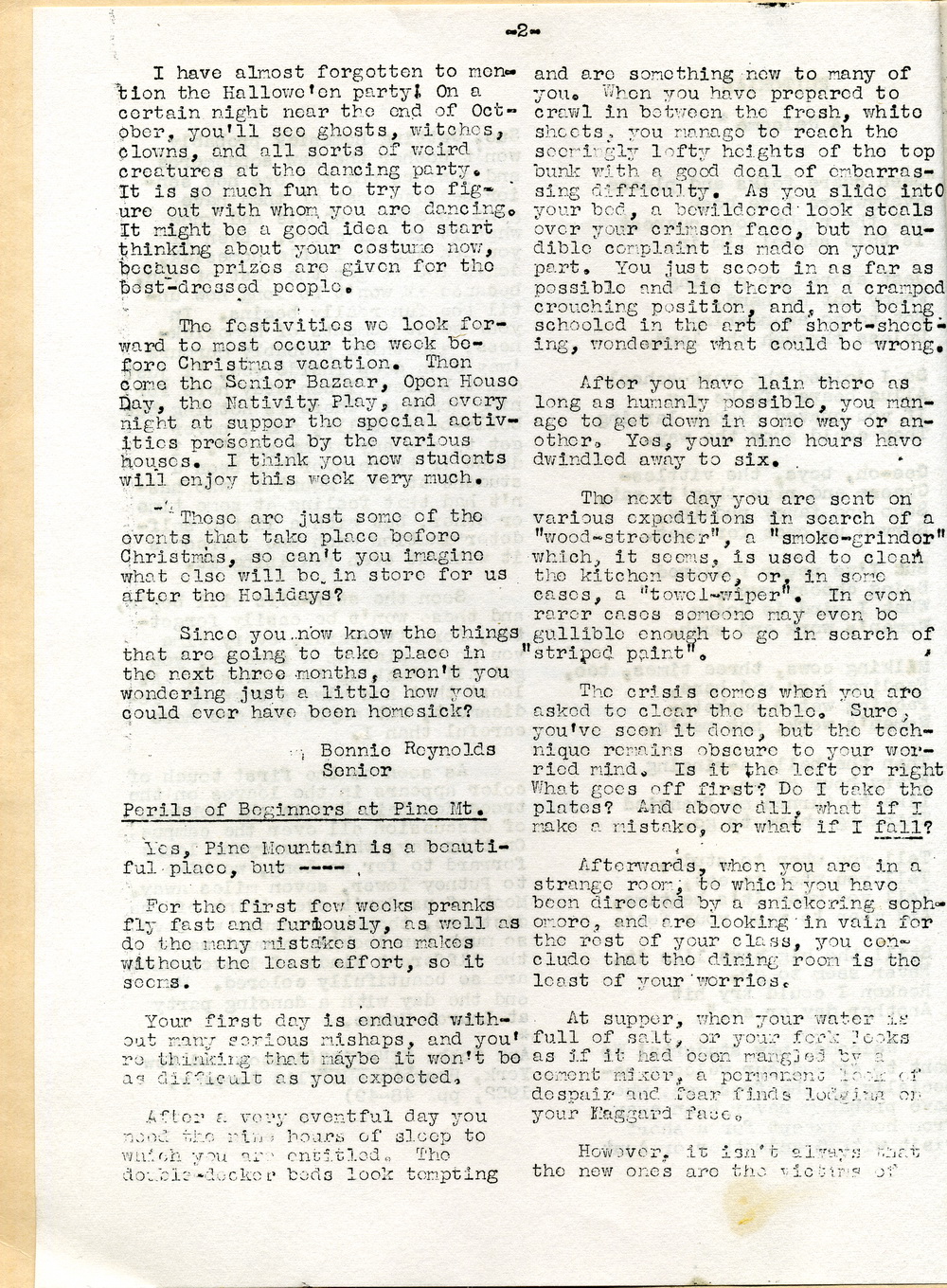 “Editorial” by Bonnie Reynolds – A Welcome discusses “homesickness” [Ann Cobb, ‘Kinfolks’ poem (Boston and New York, Houghton-MIfflin Company, 1922, pp. 48-49)]. Comments on Fall activities including stir-off and Mountain Day, Halloween, Senior Bazaar, Nativity Play.