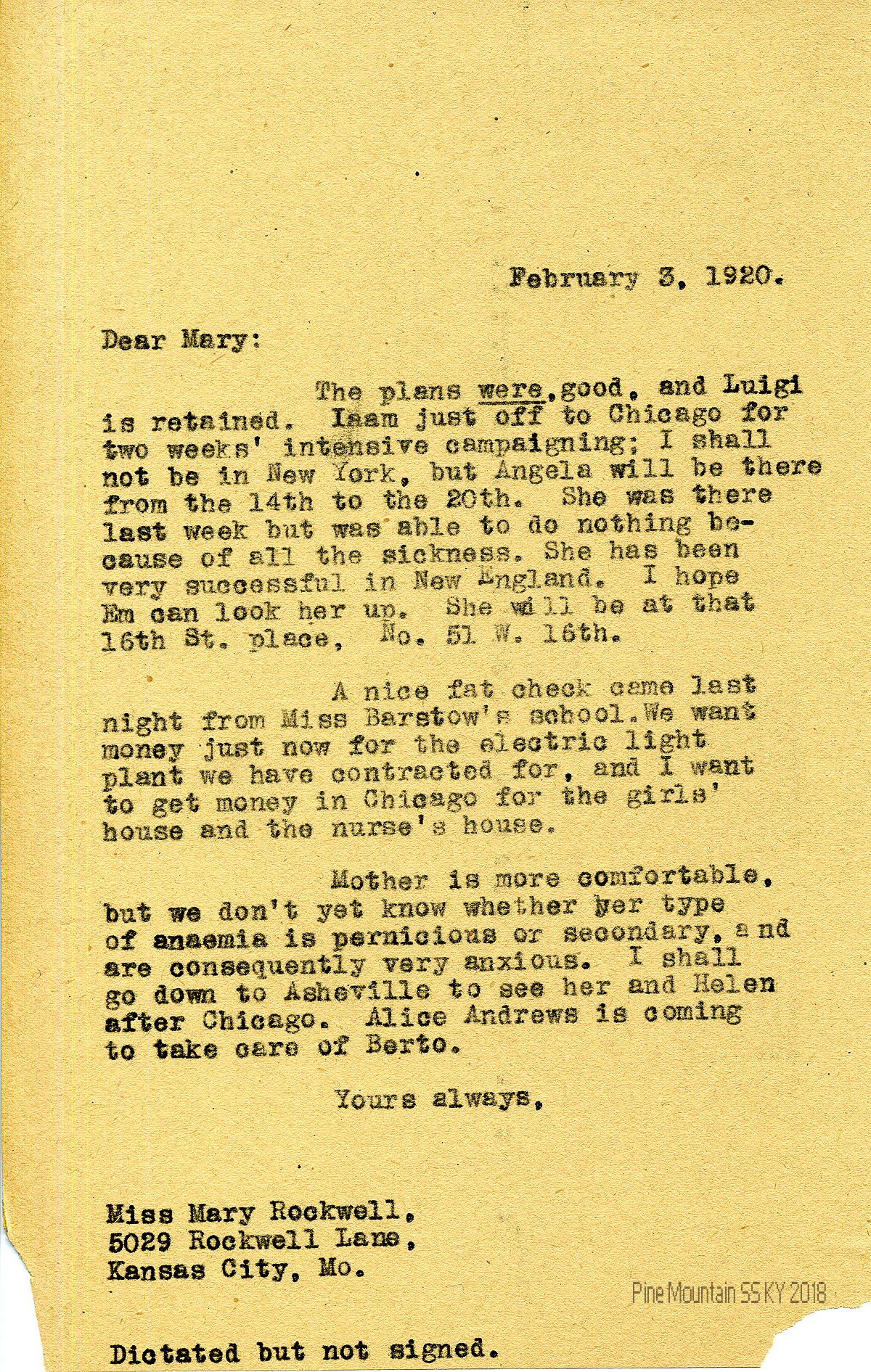 TAGS: Mary Rockwell Hook Correspondence 1920, Mary Rockwell, architecture, architects, Ethel de Long Zande, Luigi Zande, Berto Zande, fundraising, donations, Line Fork Settlement, Bertha Rockwell, Katherine Pettit, Marguerite Butler, Angela Melville, PMSS teaching methods, Medical Settlement at Big Laurel