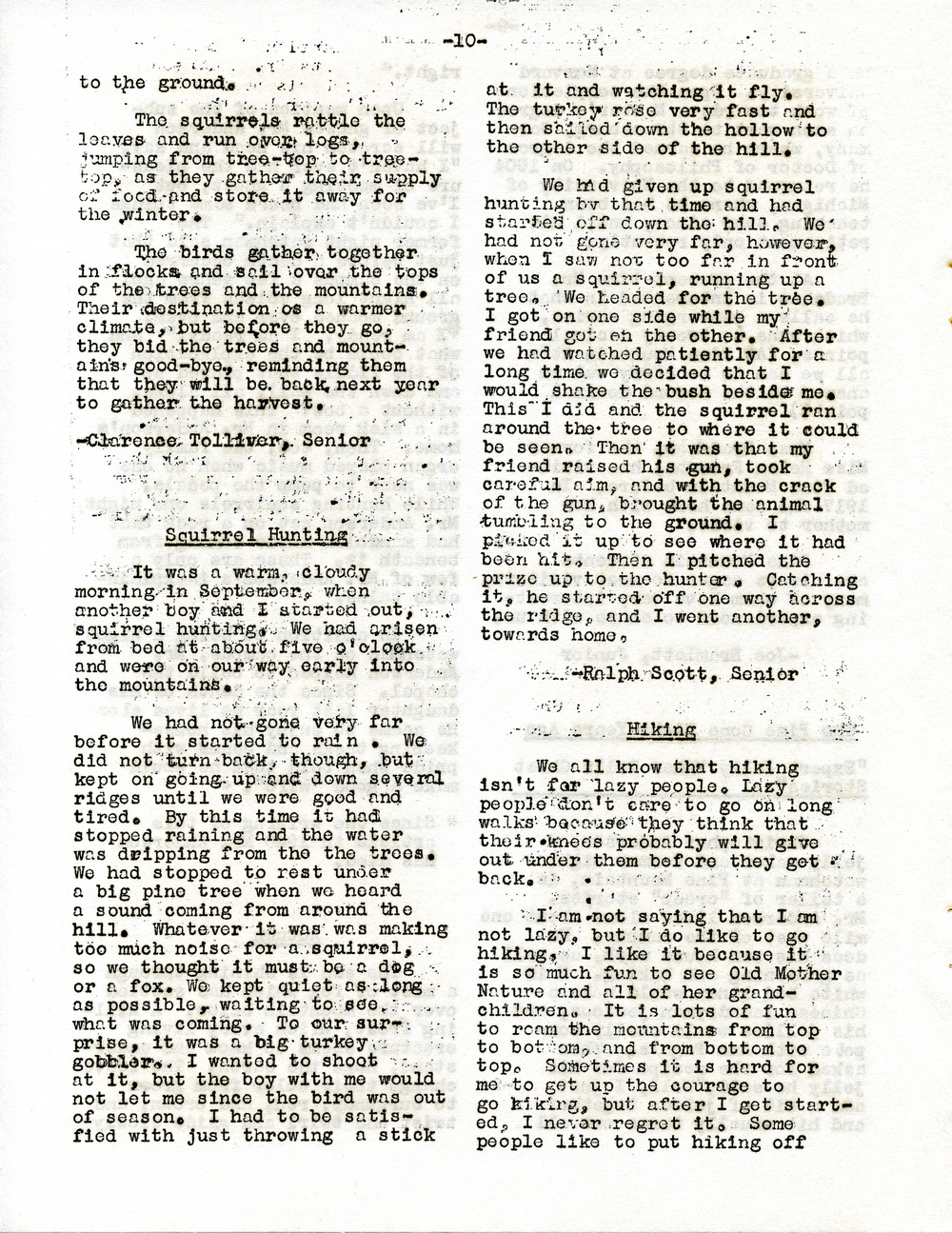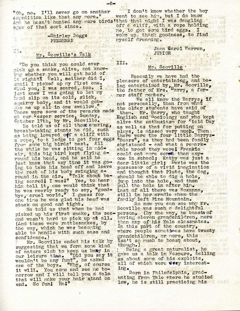 “Mr. Scoville” [Mrs. Alice Barry, former worker, and her father, Mr. Scoville, visit campus, gives nature talk; the students write as follows]: