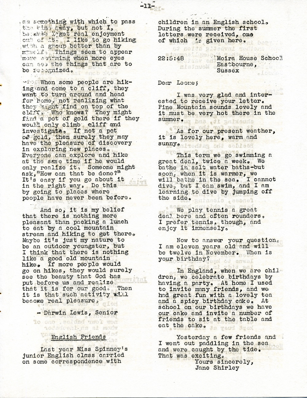 “English Friends” – Jane Shirley to Leone Sturgill [Correspondence between school students at Moira House School (Eastbourne, Sussex, England) and Miss Spinney’s junior English class]