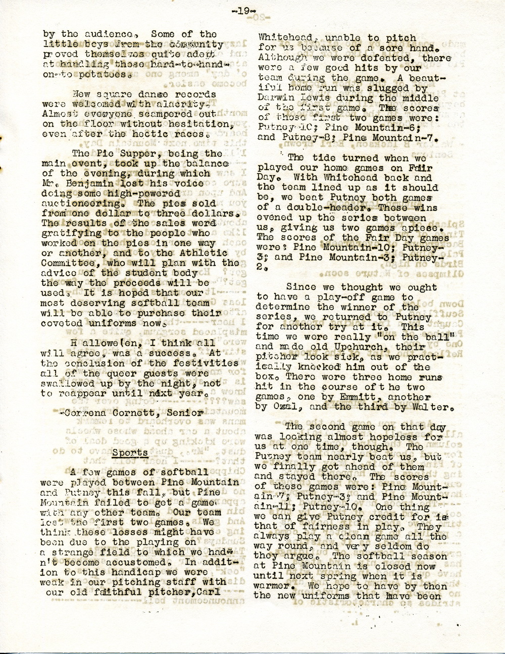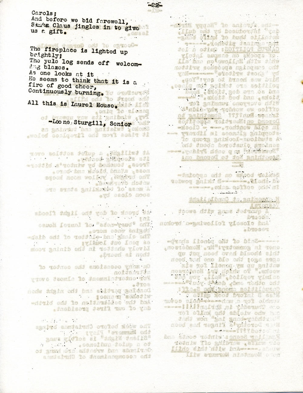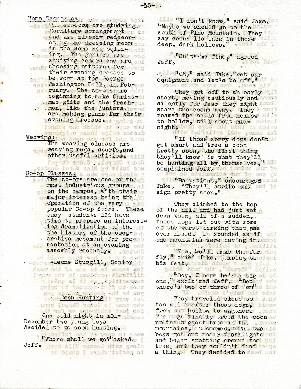“Home Economics Girls Entertain” – Margie Bennett [Four senior girls served dinner to staff members, Mrs. Little, Miss Becker, Miss (Mary Ruth) Heil, and Hobart Wilder; also a breakfast for Mr. and Mrs. Benjamin, Miss Davis and Miss Binford.]