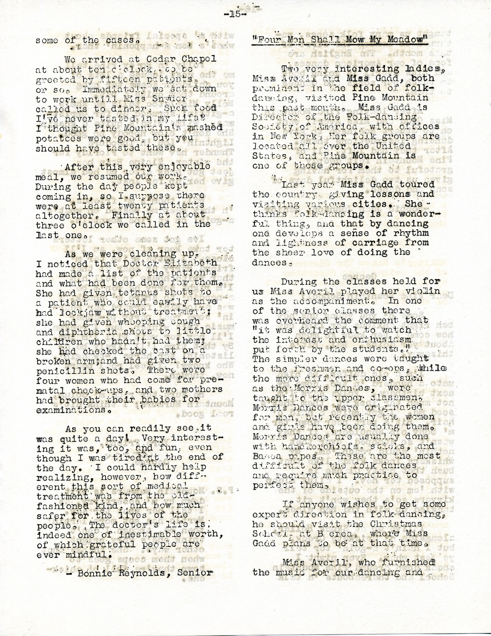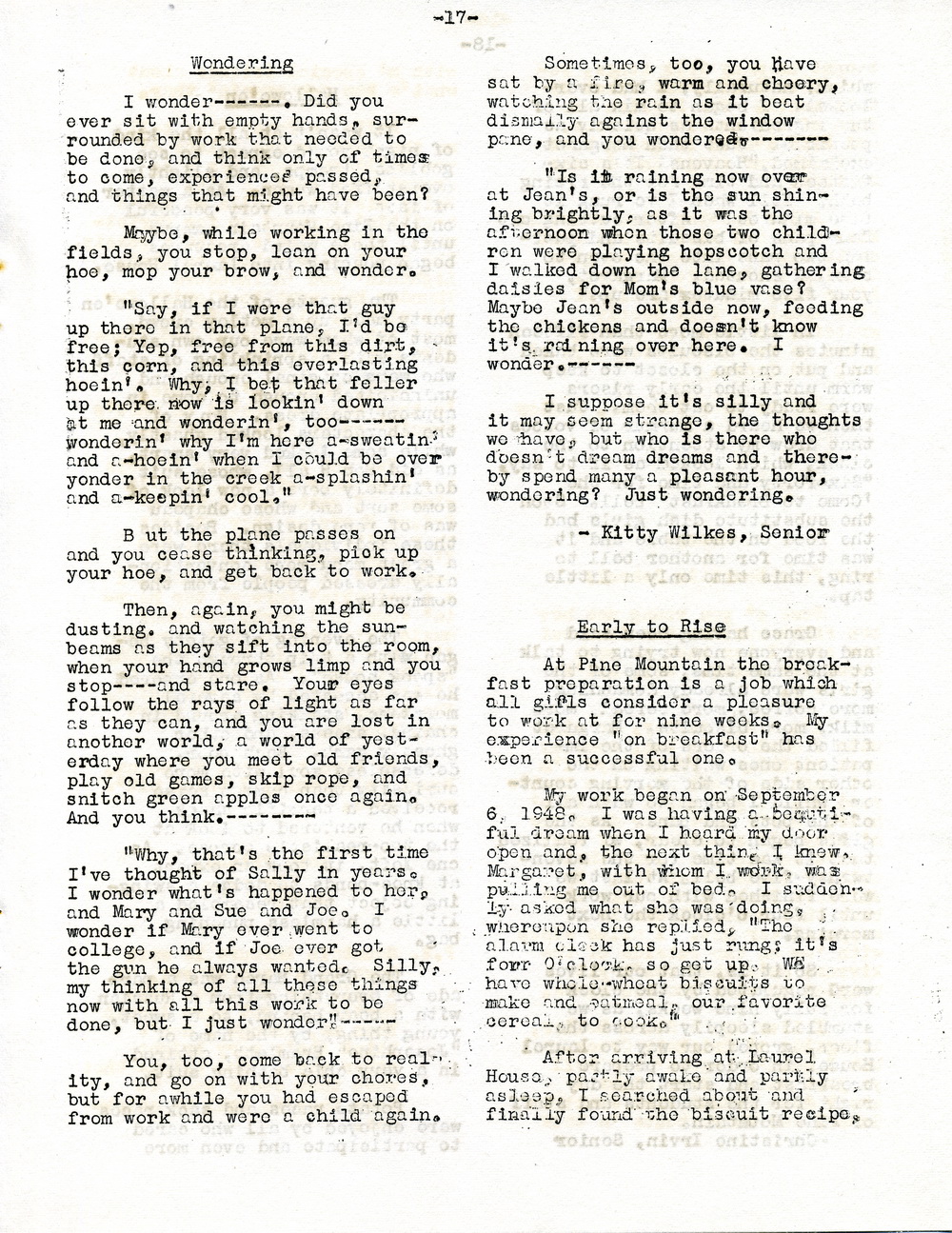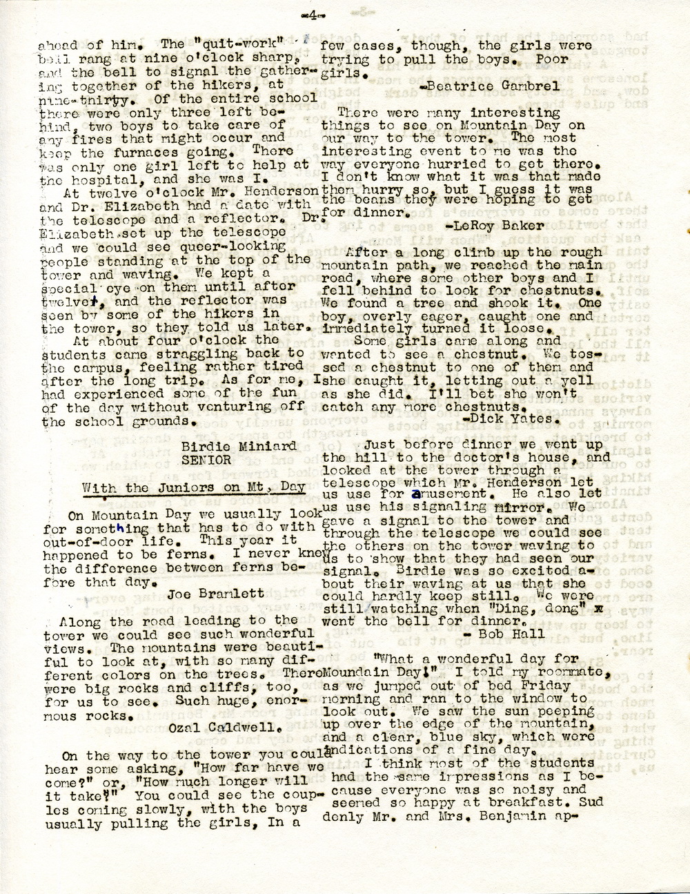 “With the Juniors on Mt. Day” – Joe Bramlett, Ozal Caldwell, Beatrice Gambrel, LeRoy Baker, Dick Yates, Bob Hall, Geraldine Boggs, Janice Spencer [Each describes his or her experience.]