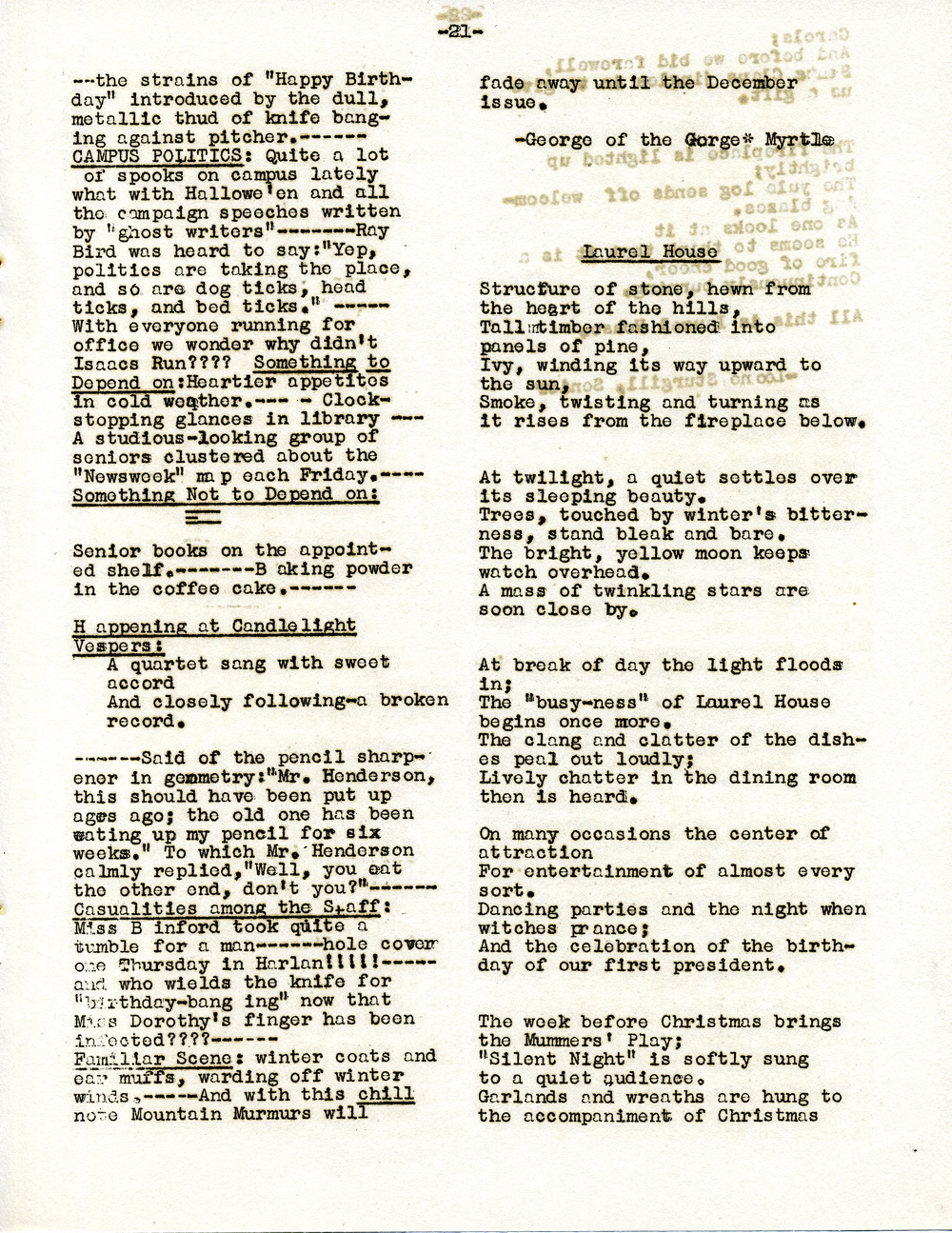 “Mountain Murmurs”, “Table Clatter and Chatter”, “Campus Politics”– George of the Gorge* Myrtle [Campus events and people]