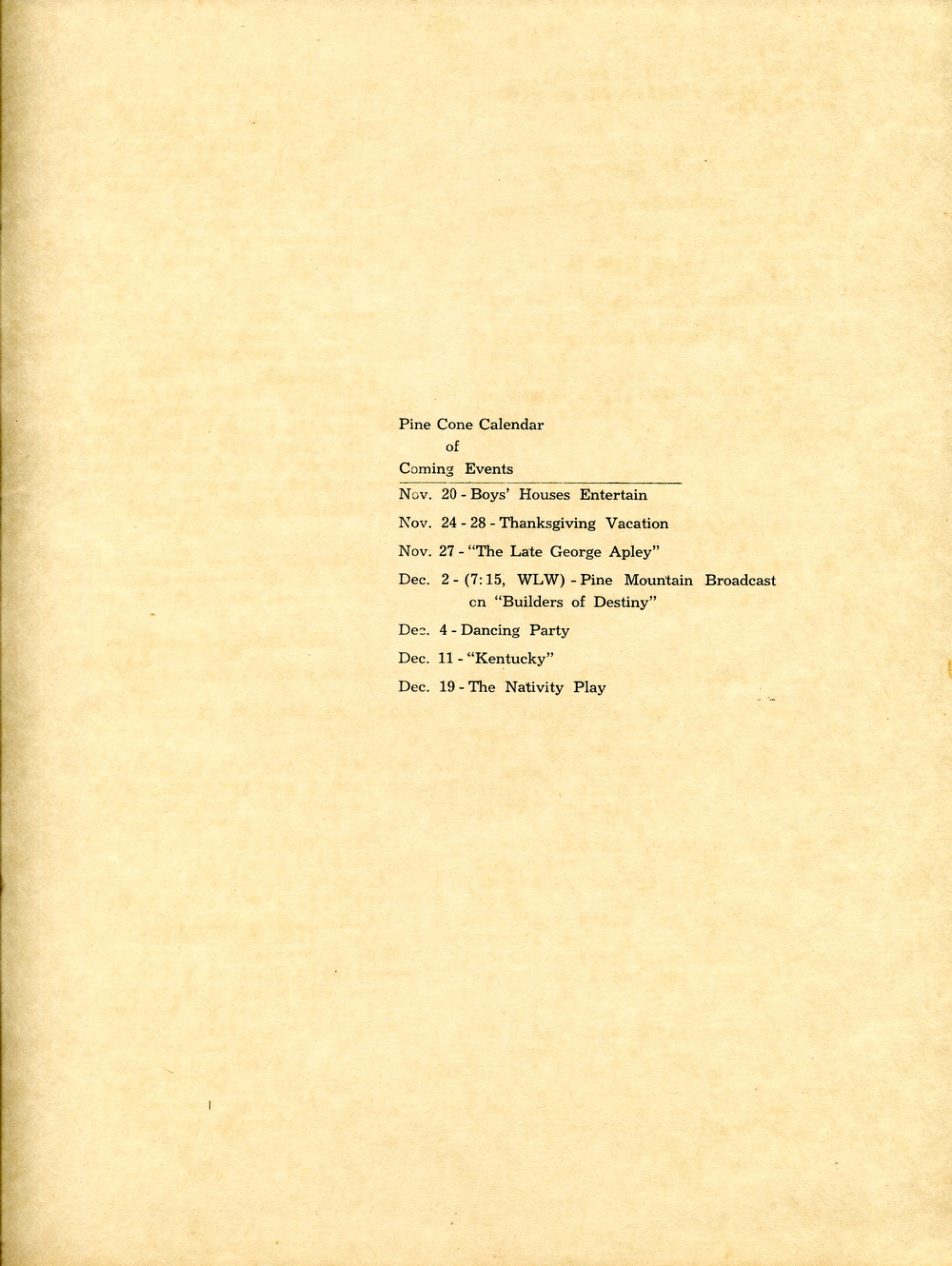 Pine Cone Calendar of Coming Events: Boys’ Houses Entertain, Thanksgiving Vacation, “The Late George Apley”, P.M. [WLW] Broadcast in “Builders of Destiny”, Dancing Party, “Kentucky”, The Nativity Play