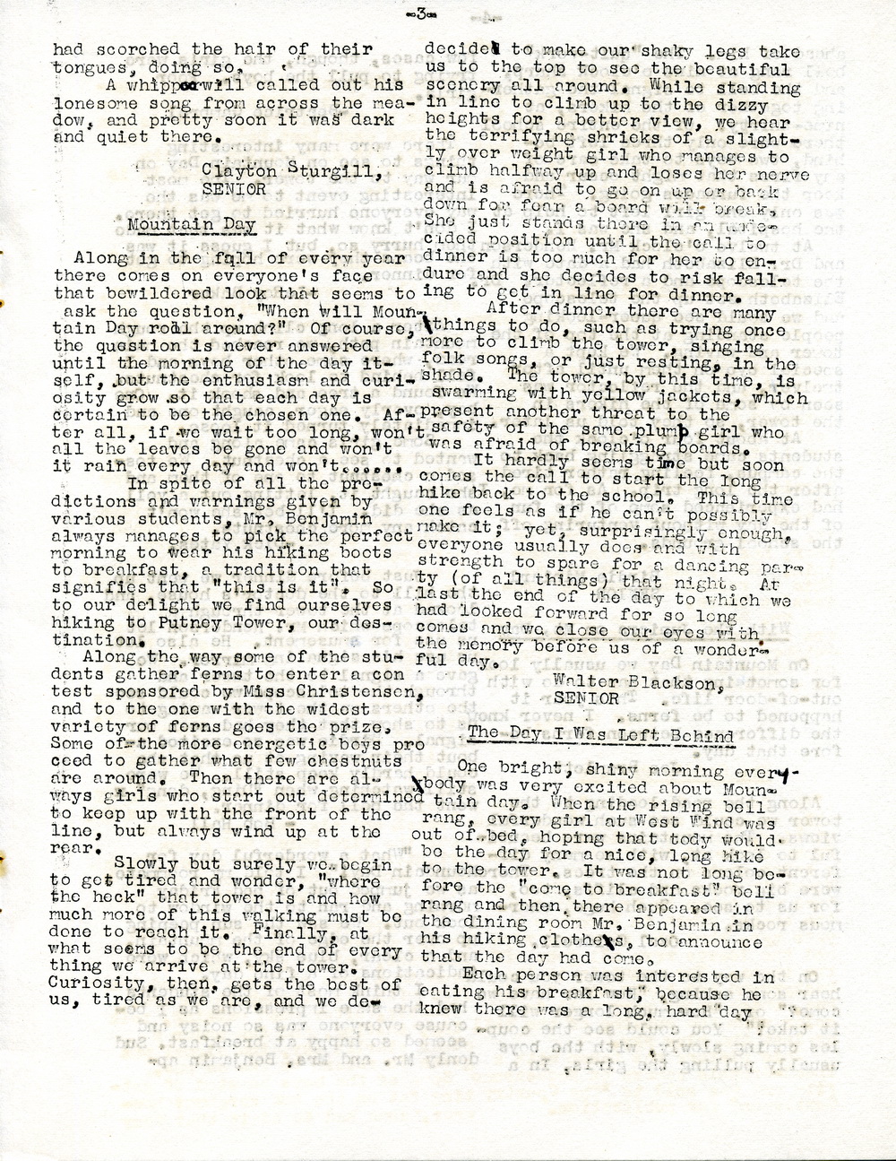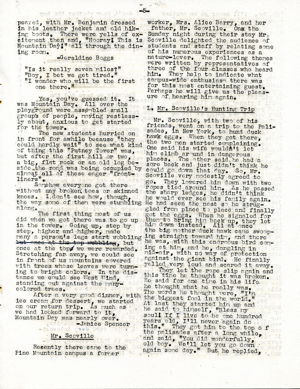 “Mountain Day” – Walter Blackson [Mr. [H.R.S.] Benjamin, Director, in hiking clothes announces traditional hike to Putney Tower]