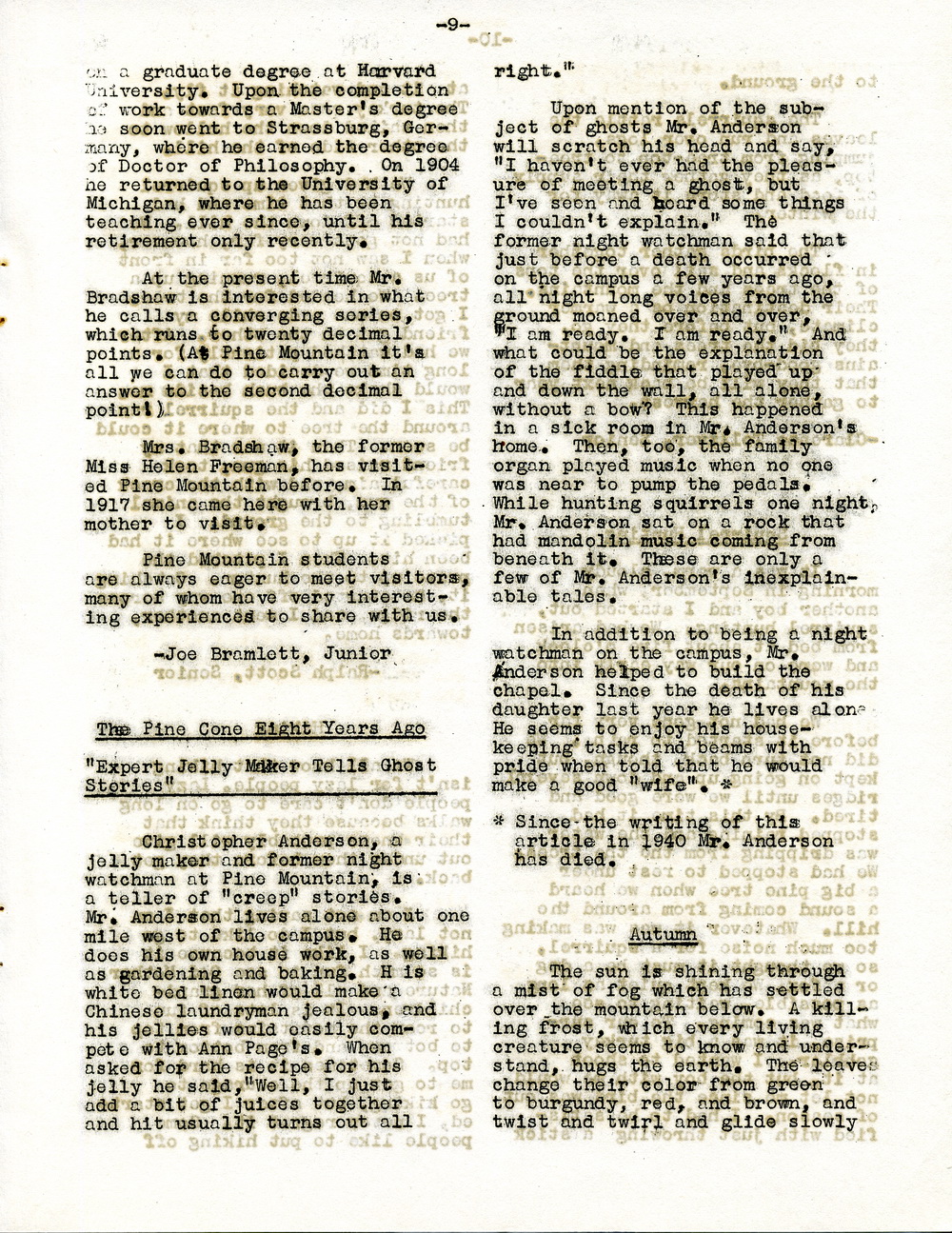 “The Pine Cone Eight Years Ago – Expert Jelly Maker Tells Ghost Stories” [Repeat story of visit with Christopher Anderson, former P.M. nightwatchman, who has since died.]