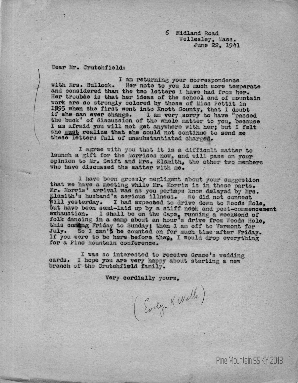 001 June 22, 1941. To Crutchfield from [unsigned, apparently Wells], in Wellesley, MA, commenting on Mrs. Bullock’s letters, indicating “her ideas of the school and of mountain work are so strongly colored by those of Miss [Katherine] Pettit in 1895 when she first went into Knott County, that I doubt if she can ever change.” Wells agrees with Crutchfield concerning a gift for the Morrises and will inform Mr. Swift and Mrs. [Dorothy Olcott] Elsmith of Crutchfield’s opinion. She indicates when she is free for a meeting with Mr. Morris at Woods Hole and mentions receiving wedding cards from Grace.