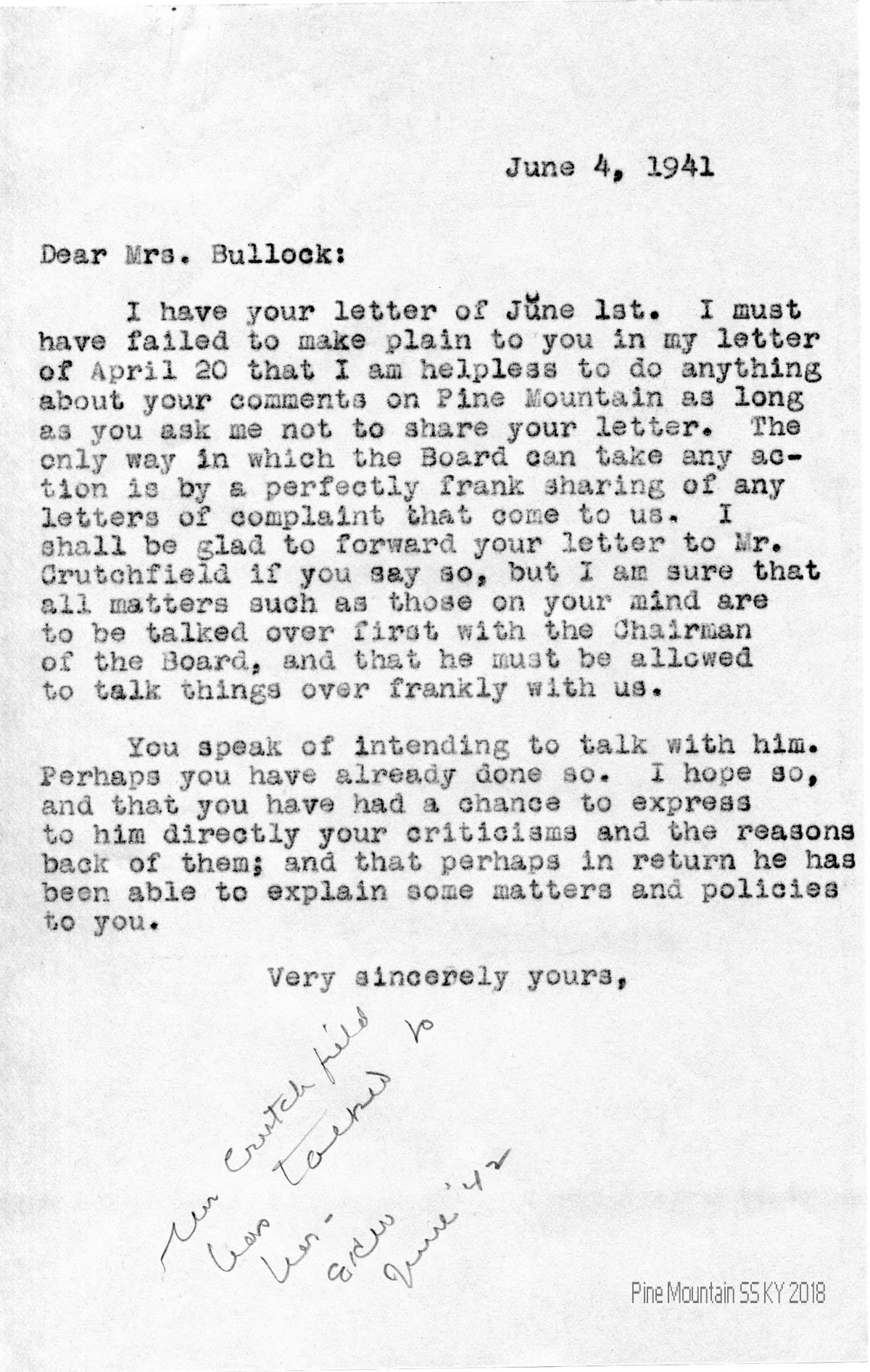 002 June 4, 1941. To Bullock from [unsigned, apparently Wells], responding to Bullock’s letter of June 1st criticizing the School. Bullock is not willing to share her criticisms with other trustees, but Wells writes that they should be discussed with the board chairman and “that he must be allowed to talk things over frankly with us.” She hopes Bullock has talked with Crutchfield. [Handwritten note in bottom margin: “Mr Crutchfield has talked to her – EKW June ‘42.”]