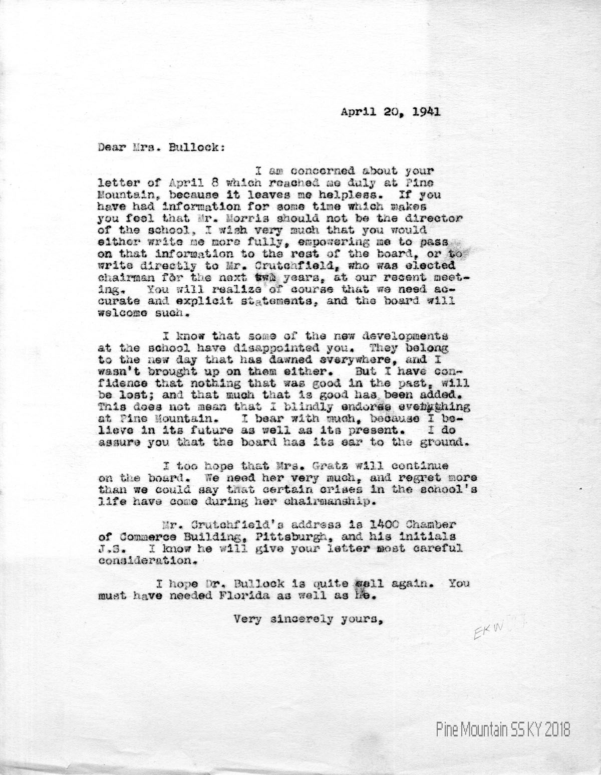 005 April 20, 1941. To Bullock from [unsigned, apparently Wells], responding to Bullock’s April 8th letter, telling Bullock she should write her criticisms of Glyn Morris and the new developments at the School more fully and send them to the appropriate board members. She then assures Bullock that “nothing that was good in the past will be lost; and that much that is good has been added. This does not mean that I blindly endorse everything at Pine Mountain. I bear with much, because I believe in its future as well as its present.”