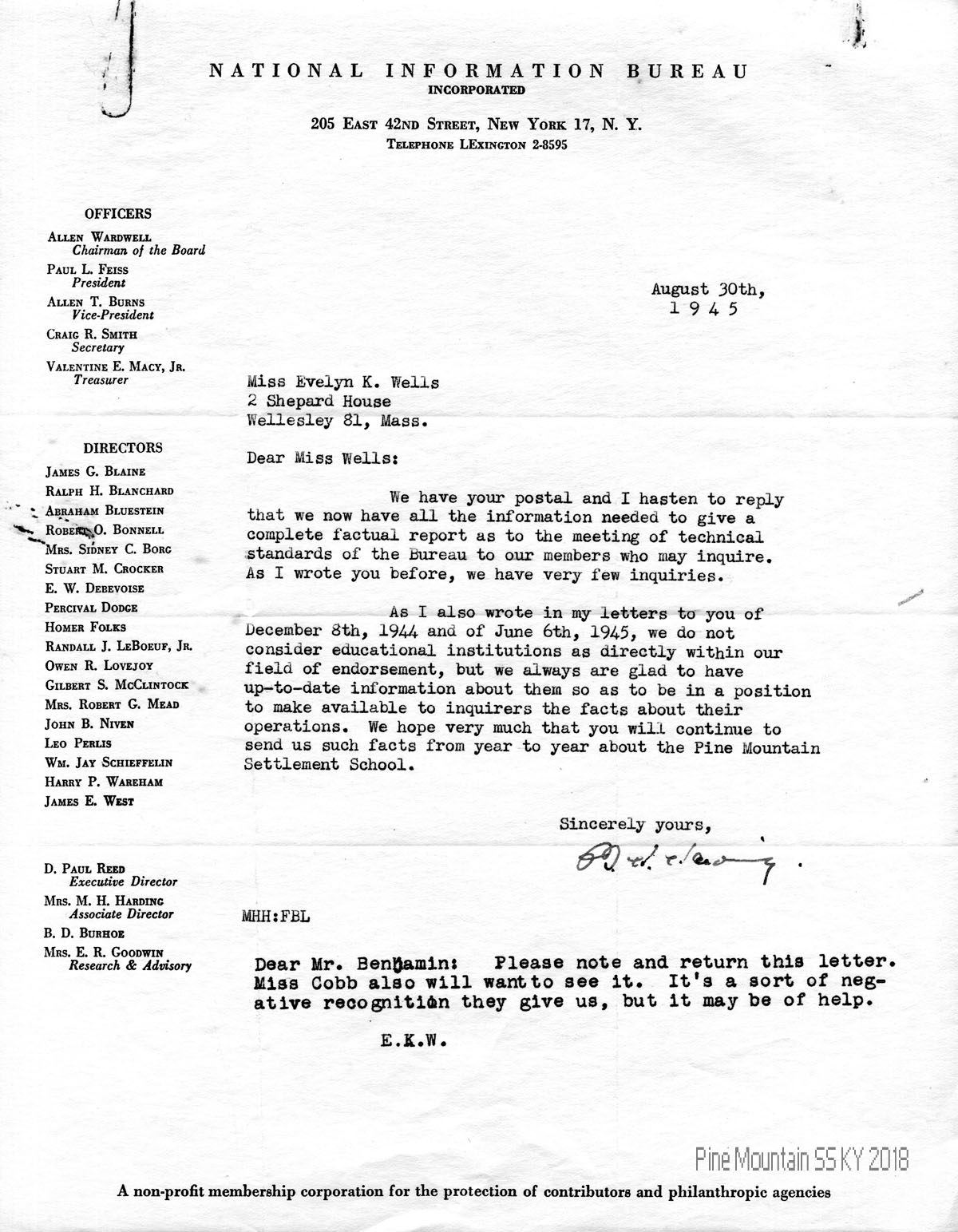 | [03] August 30, 1945 | Mrs. M.H. Harding to Evelyn Wells concerning the National Information Bureau’s receipt of updated information about the school. Do not consider educational institutions as directly within their field of endorsement. Will provide facts about their operations. Note from Wells at bottom of the letter “Dear Mr. Benjamin: Please note and return this letter. Miss [Alice] Cobb also will want to see it. It’s a sort of negative recognition they give us, but it may be of help.” | 1 |
