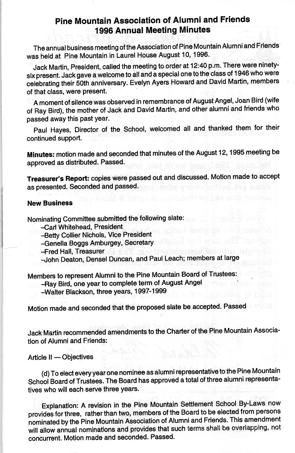 “Pine Mountain Association of Alumni and Friends 1996 Annual Meeting Minutes.” Minutes of a meeting held in Laurel House, Pine Mountain, on August 10, 1996, with Jack Martin as president and 96 attendees. The following subjects were covered: