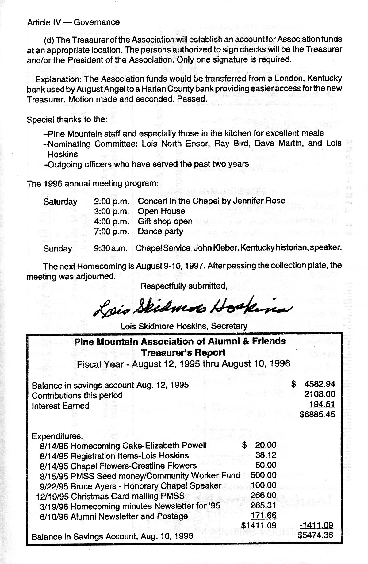 The report ends with the Treasurer’s Report for the fiscal year of August 12, 1995, through August 10, 1996.
