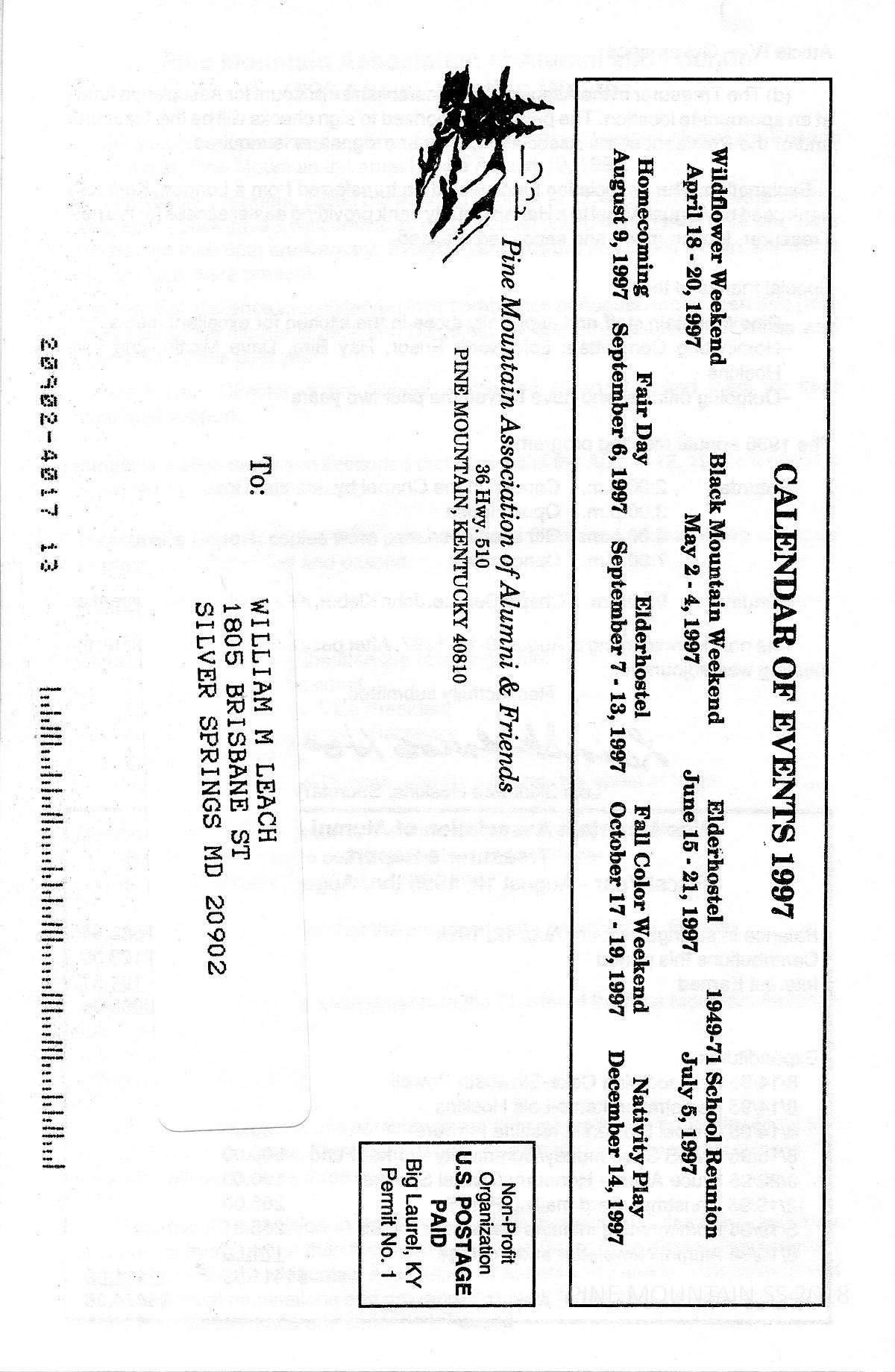 TAGS: Alumni relations 1997 Newsletter: Homecoming; Pine Mountain Settlement School; Alumni Association Newsletter; 1996 meeting minutes; class of 1946; treasurer’s report; slates of nominations; amendments to the Charter; 1997 Calendar of Events; list of members and friends; 1997 registration forms