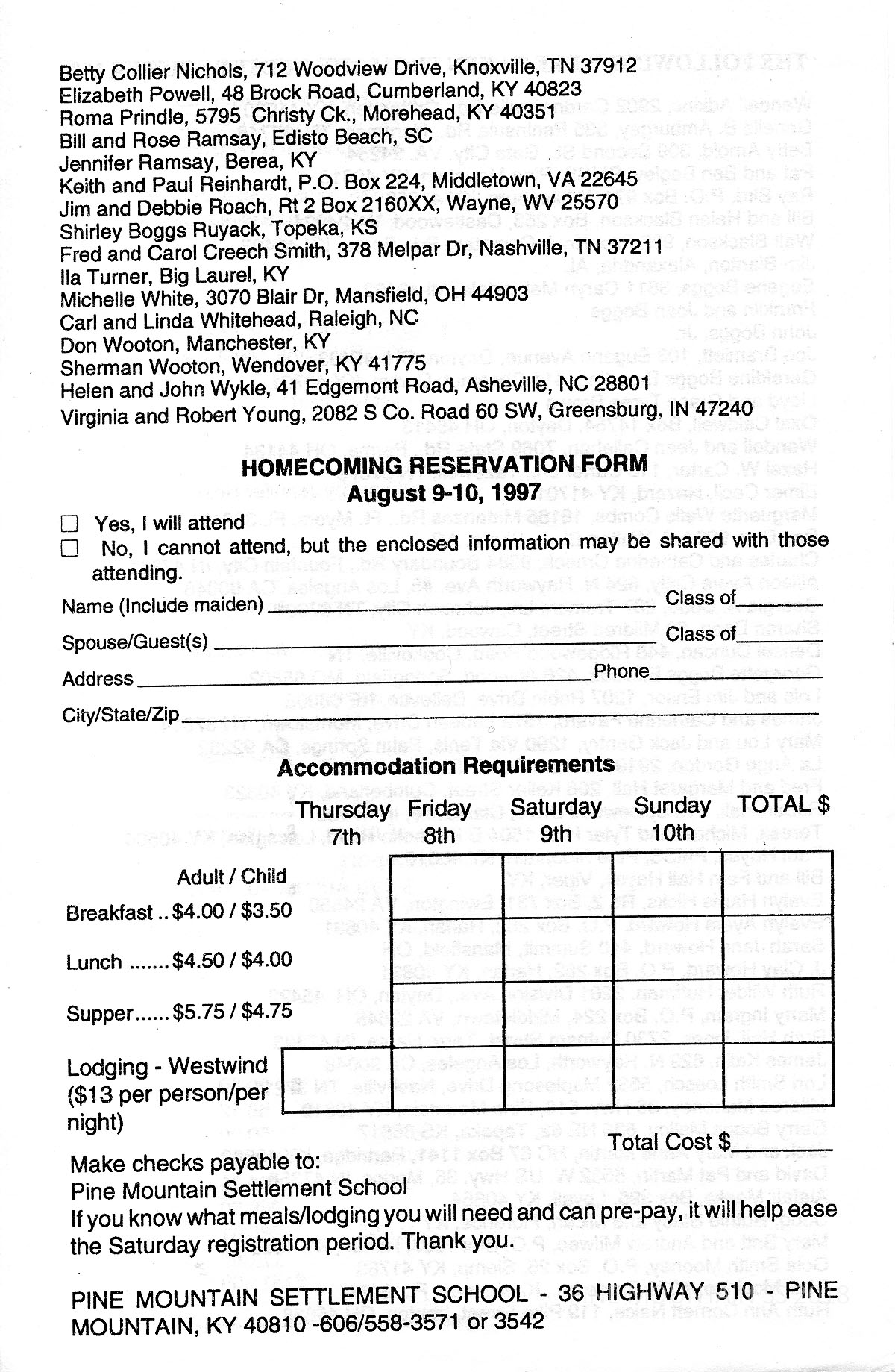 [1997_alum_friend_newsletter_006.jpg] Continuation of list of names and addresses; Homecoming 1997 Reservation Form; form for indicating the guest’s Accommodation Requirements.