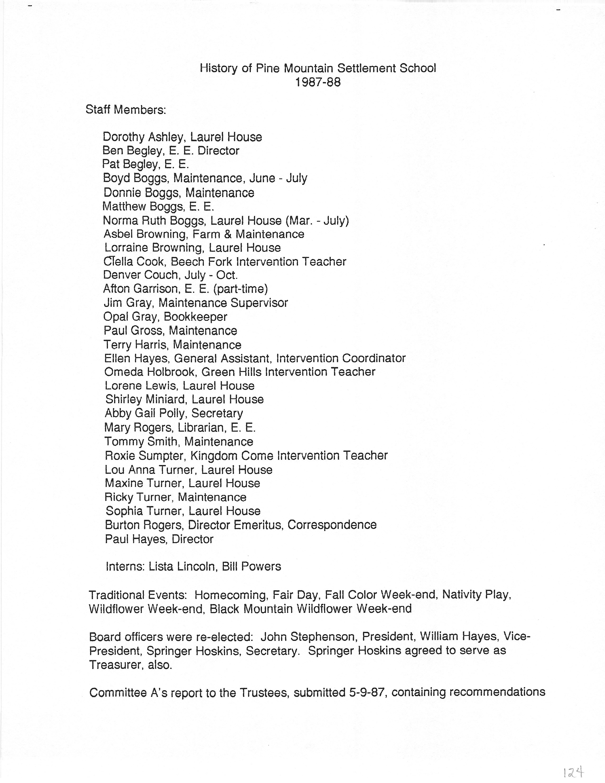 Tags: History PMSS summary 1987-1988, staff members, interns, traditional events, other events, Trustees, West Wind, Old Log, G.E.D. students, Homemakers’ Club, summer workers, flagpoles, intervention programs, Medical Botany weekend