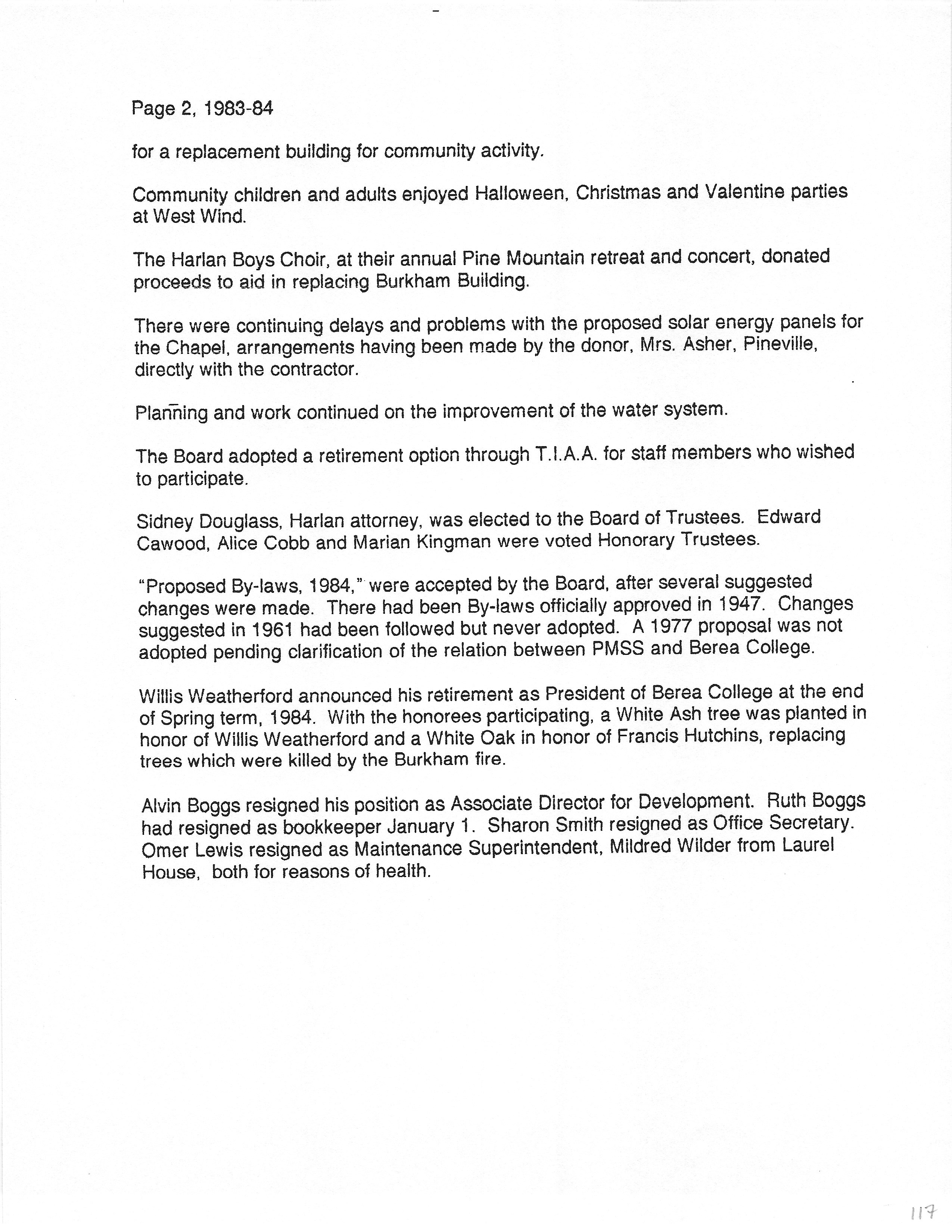 Tags: History PMSS summary 1983-1984, staff members, interns, events, Burkham School House burning, Harlan Boys Choir, Chapel, solar energy panels, water systems, trustees, TIAA, by-laws, resignations