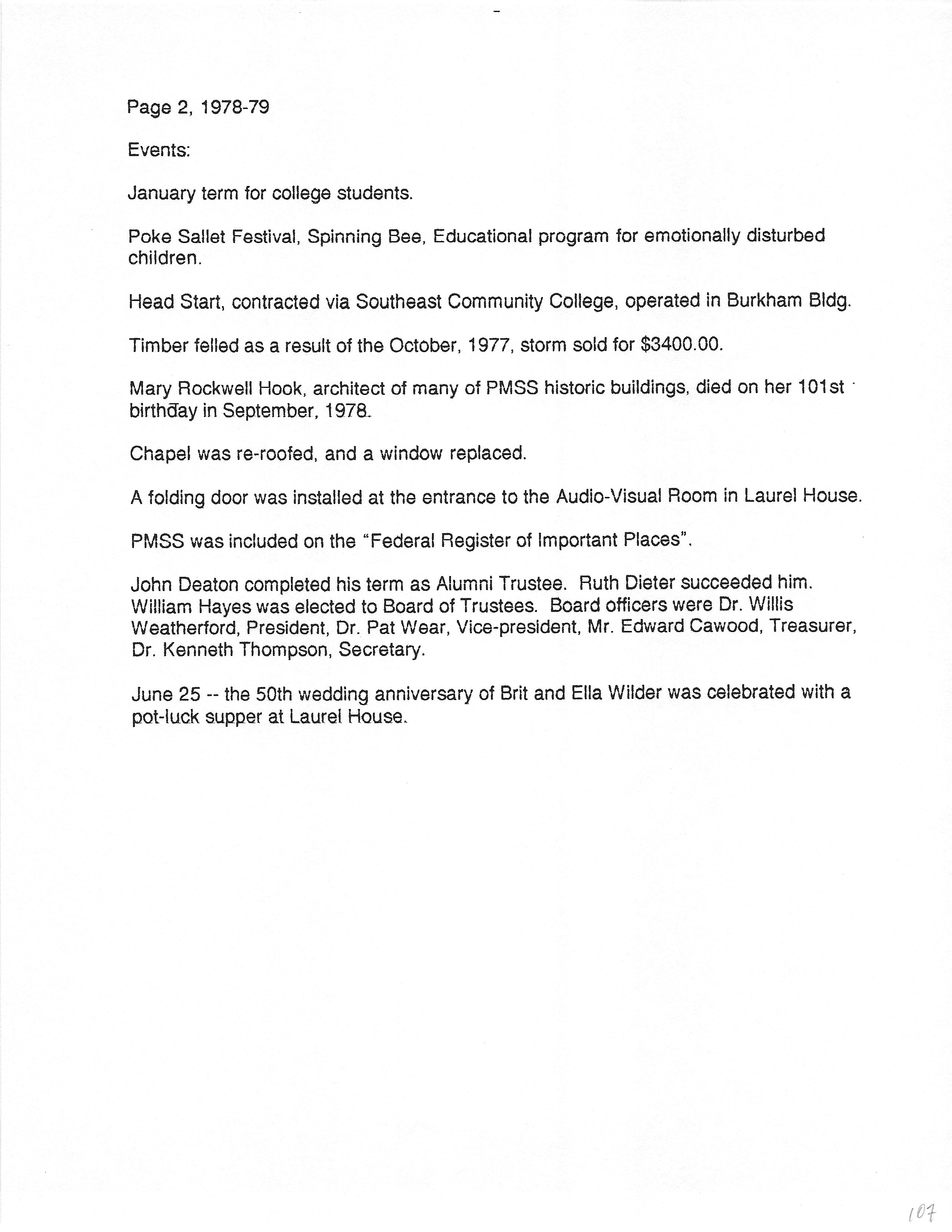 Tags: History PMSS summary 1978-1979, staff, interns, events, festivals, Head Start, timber sales, Mary Rockwell Hook, Chapel, Federal Register, trustees