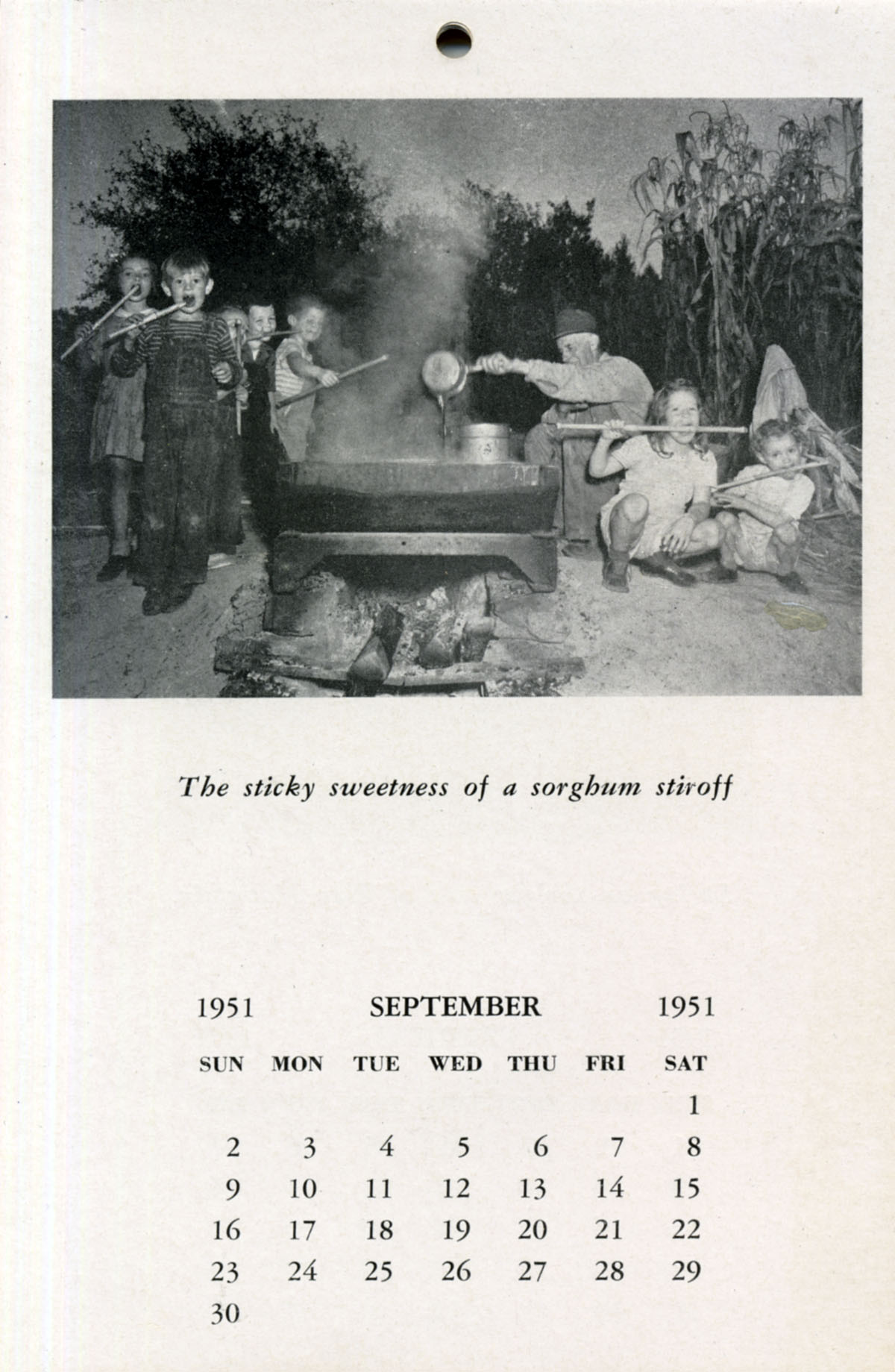 TAGS: PMSS calendar 1951, Community School, photographs of Community School students, snow, Isaacs Creek, singing, chapel, chapel bell, Old Log, sorghum stir-off, fields, Big Log, hay stack in community, Greasy Creek in winter