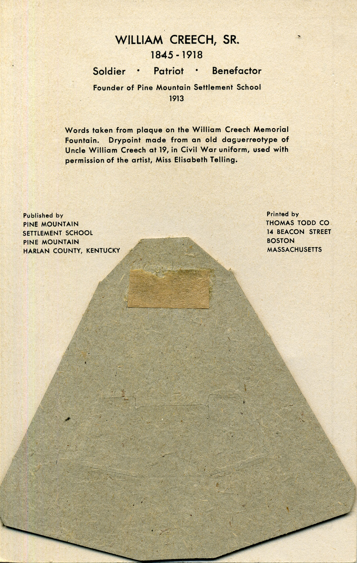 The 1946 PMSS Calendar is a small and very simple presentation of the exquisite engraving executed by Elisabeth Telling of a young William Creech. Telling took the image from Creech’s Civil War photograph. The image has long been an iconic image for Pine Mountain Settlement School and may be found on other promotional literature.