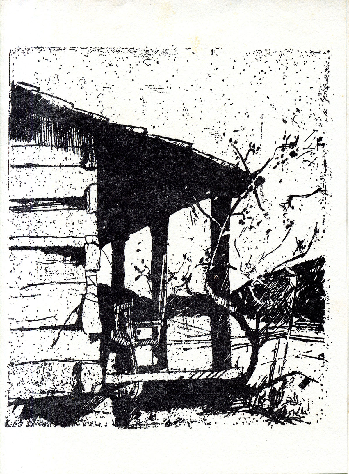 The 1971 PMSS Calendar from Pine Mountain Settlement School (PMSS) is a rich and beautifully rendered close-up view of Aunt Sal’s Cabin, a landmark at the settlement school.