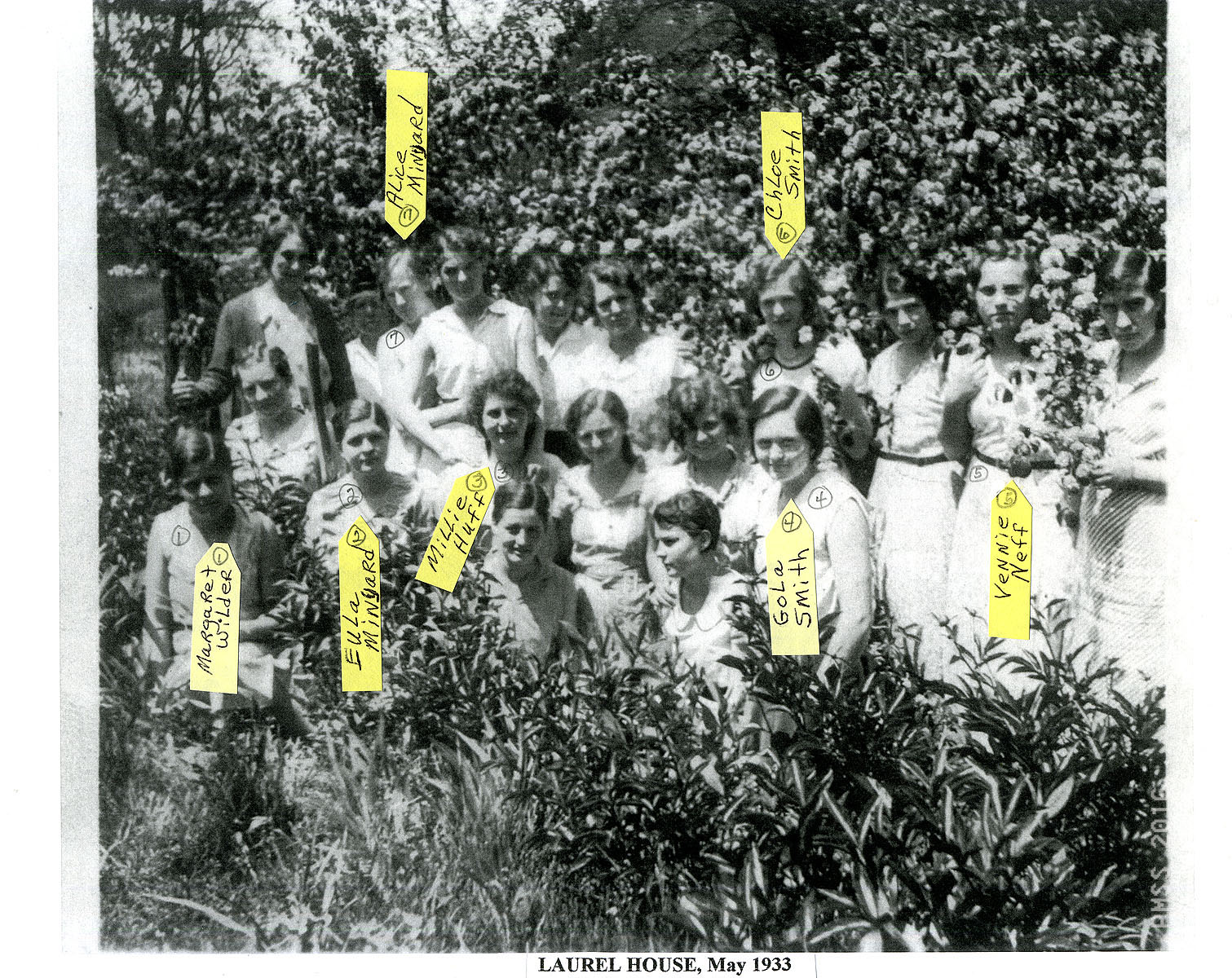 - “Laurel House, May 1933.”(Front from Left) Margaret Wilder (1), Eula Minyard (2), Millie Huff (3), ????, Gola Smith (4). (Back Row from Left) Alice Miniard, (7) Chloe Smith (6), Vinnie Neff (5). “For Vennie Huff, Laurel House, May ’33. Vinnie Neff 2nd from back row.” [neff_vennie_014.jpg]