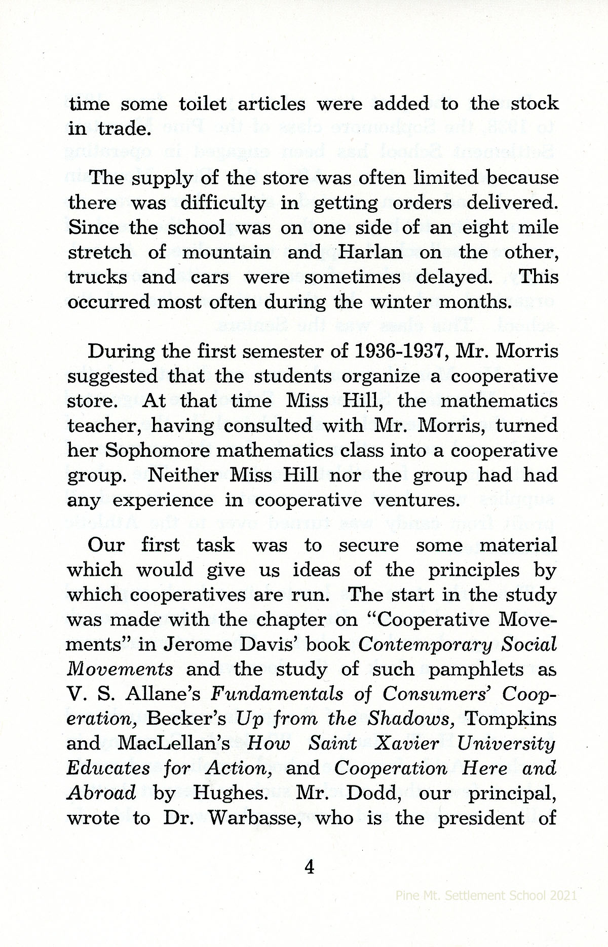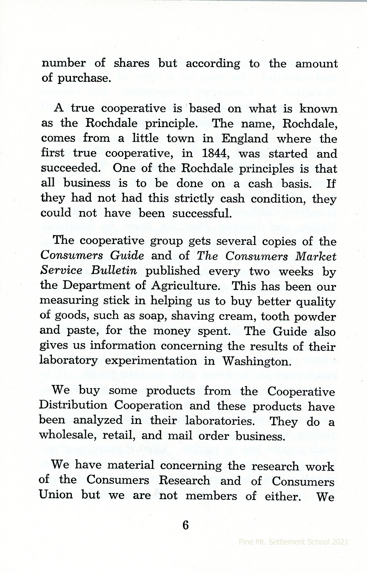 Schulman’s article describes the Co-op at Pine Mountain Settlement School in operation since 1937, as an exemplary model. He describes the mountain co-op store on campus as largely centered on an inventory of groceries and school supplies and modeled on the Rochdale principles as a base for the sophomore curriculum at the School. He outlines the Rochdale principles: