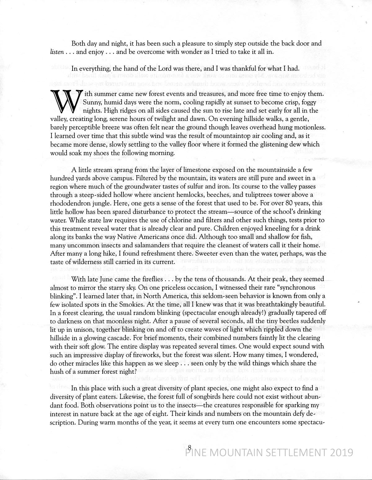 Smith describes his leaving PMSS on July 23, 1995, and his “rustic mountain home.” He decides to spend his last night writing his story, a thanksgiving prayer, a tribute to “the many dear people who have played a part” and an inspiration to friends and family to visit Pine Mountain, in reality or in their minds.