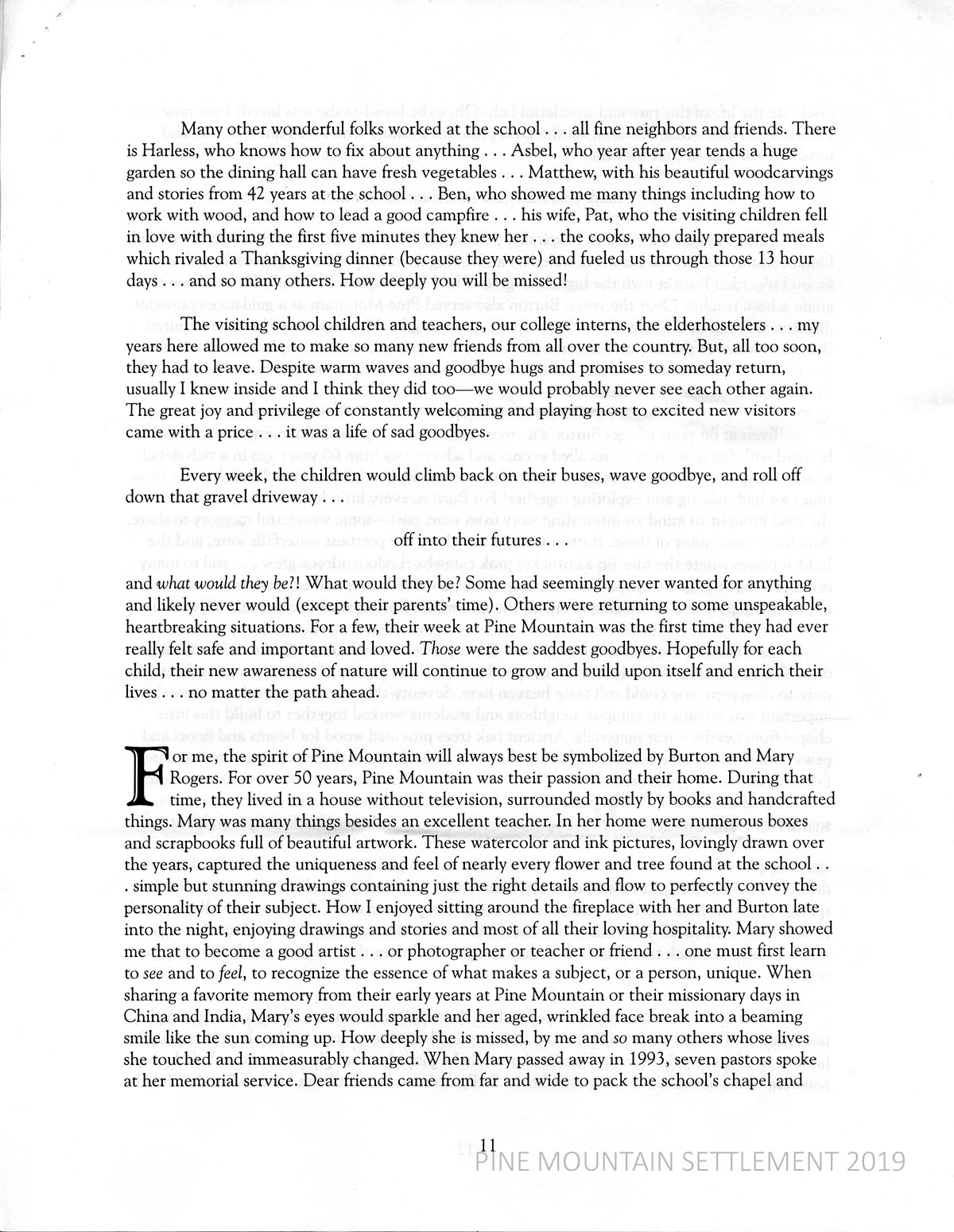 Smith continues his fond remembrances of PMSS folk: Harless (Barton), Asbel (Browning), Matthew (Boggs), Ben and Pat (Begley), the cooks; visiting school children and teachers, PMSS’s college interns, and elderhostelers. He then describes the lives of Burton and Mary Rogers.