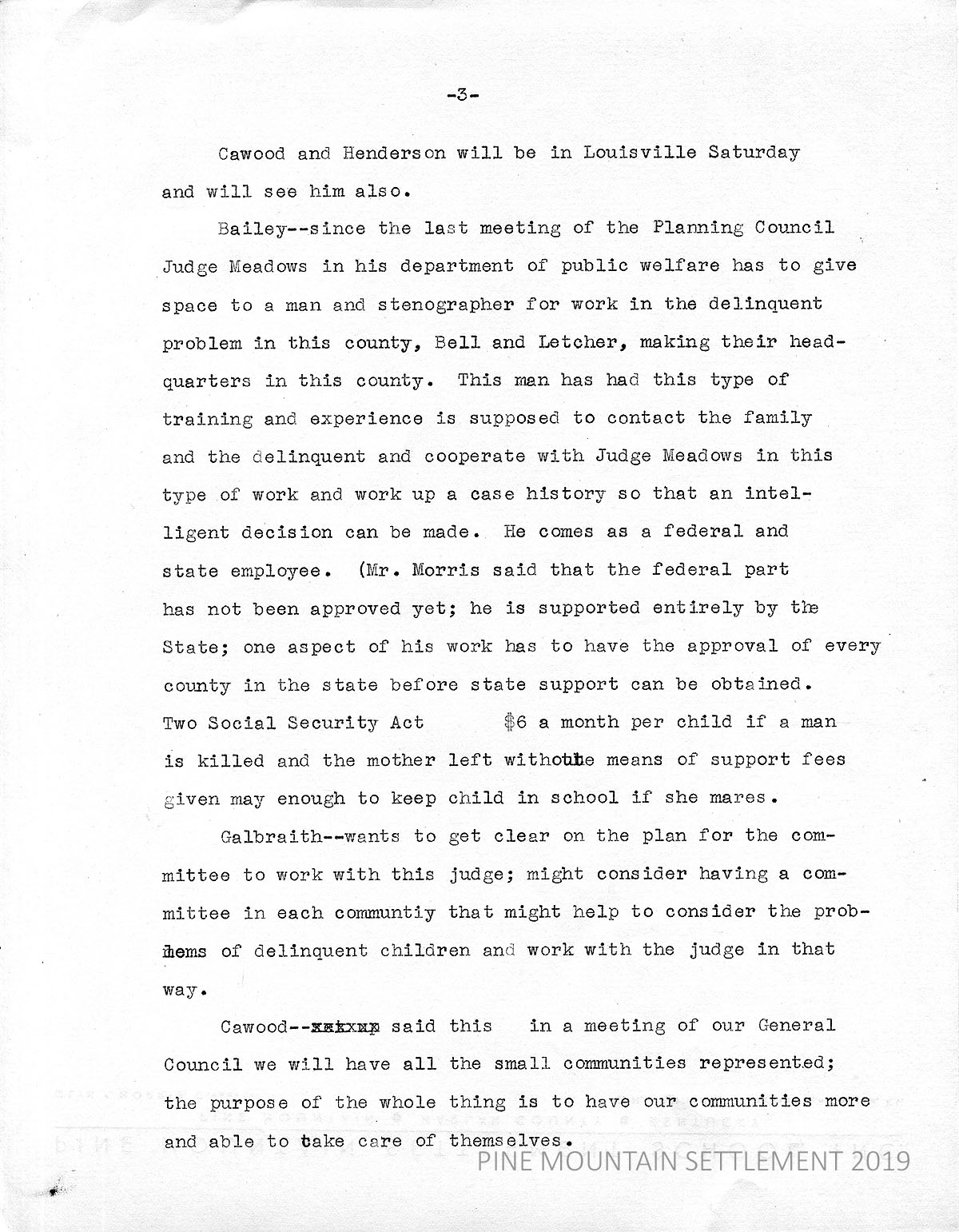 Bailey — since the last meeting of the Planning Council Judge Meadows in his department of public welfare has to give space to a man and stenographer for work in the delinquent problem in this county, Bell, and Letcher, making their headquarters in this county. This man has had this type of training and experience, is supposed to contact the family and the delinquent and cooperate with Judge Meadows in this type of work and work up a case history so that an intelligent decision can be made. He comes as a federal and state employee. (Mr. Morris said that the federal part has not been approved yet; he is supported entirely by the State; one aspect of his work has to have the approval of every county in the state before state support can be obtained. Two Social Security Act: $6 a month per child if a man is killed and the mother left without means of support; fees given may (be) enough to keep child in school if she cares(?).