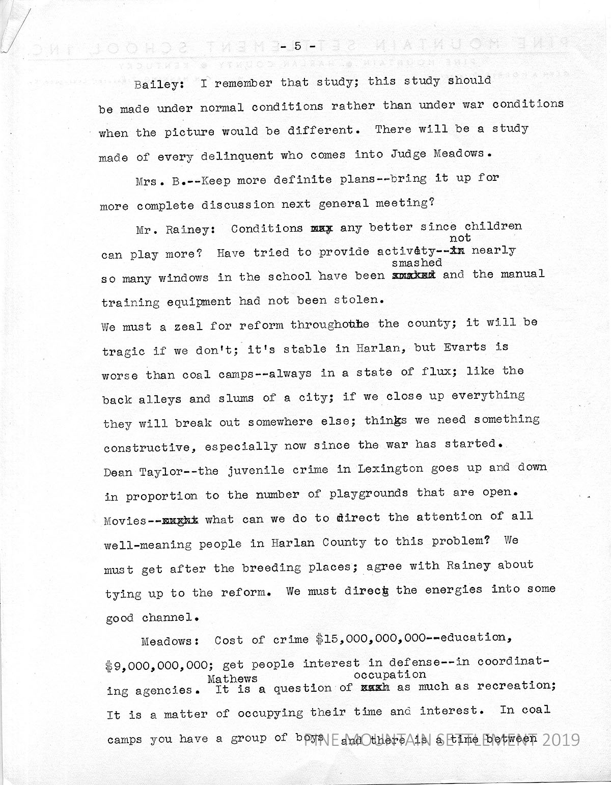 Dean Taylor — The juvenile crime in Lexington goes up and down in proportion to the number of playgrounds that are open. Movies — what can we do to direct the attention of all well-meaning people in Harlan County to this problem? We must get after the breeding places; agree with Rainey about tying up to the reform. We must direct the energies into some good channel.
