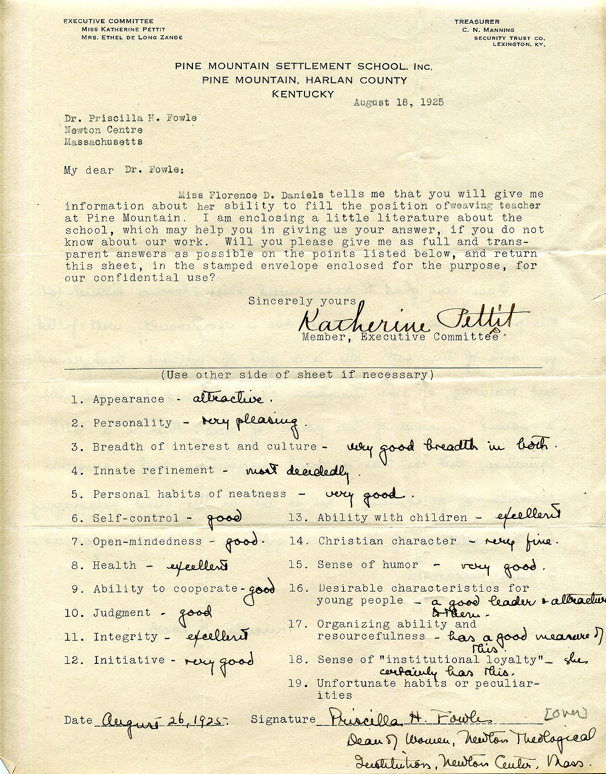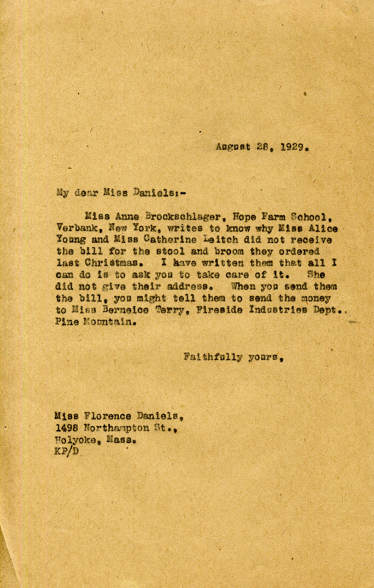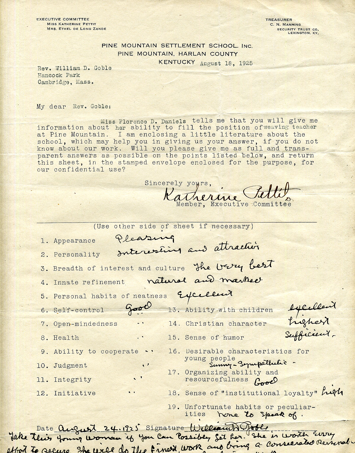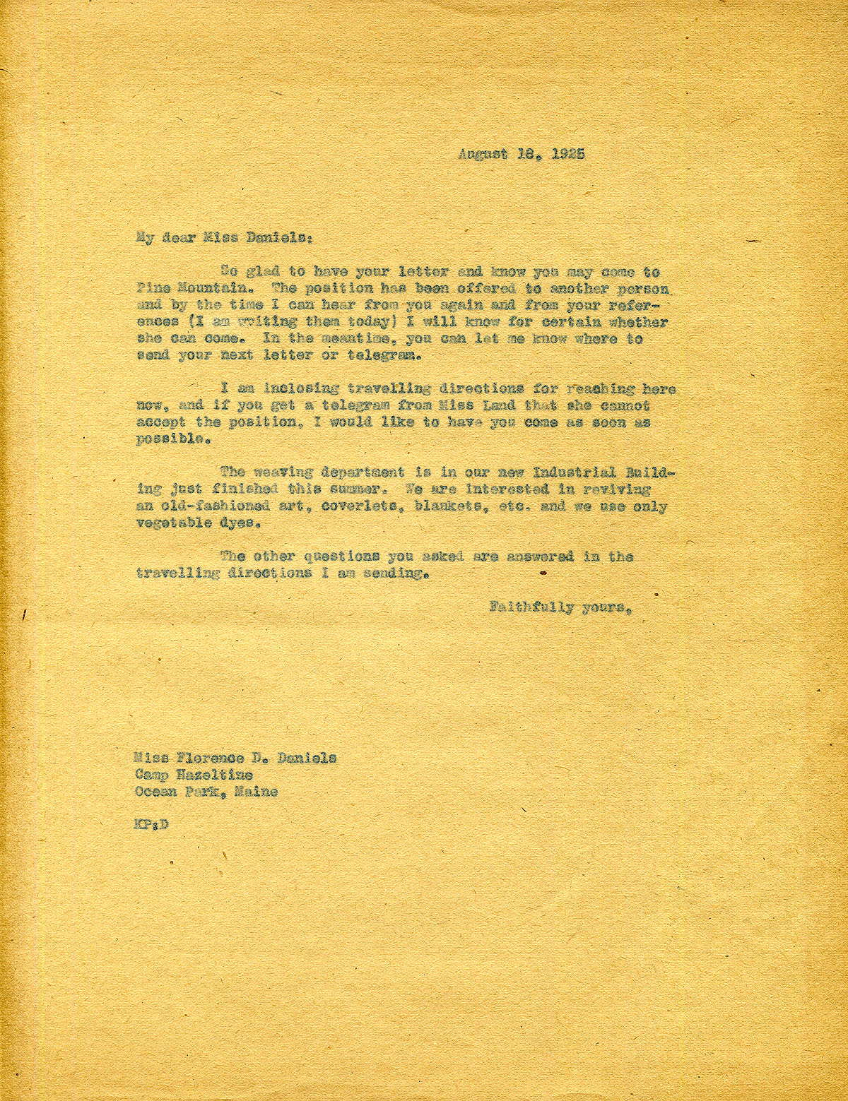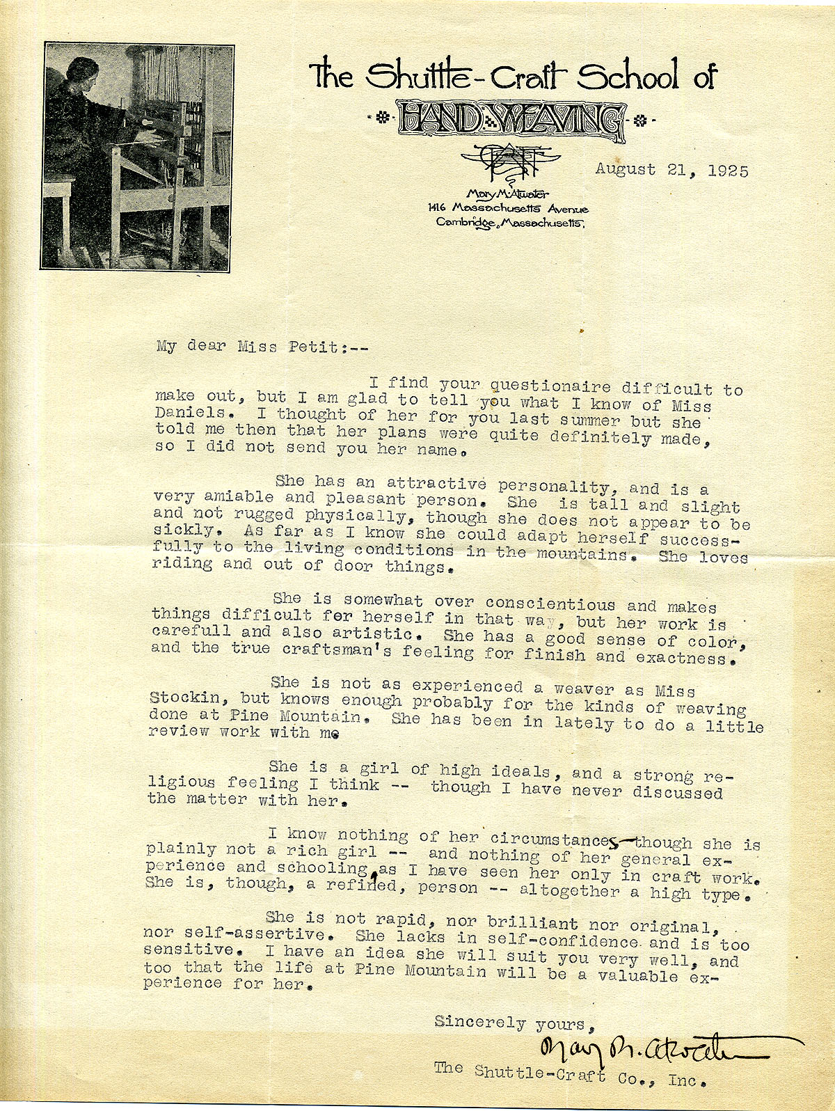 8. August 21. Letter of recommendation from Mary M. Atwater, Director of The Shuttle-Craft School of Handweaving in Cambridge Massachusetts, to Katherine Pettit regarding the employment of Florence Daniels and suggests that Daniels is “over conscientious and makes things difficult for herself in that way but work is carefull (sic) and also artistic.” Further, “She is a girl of high ideals, and a strong religious feeling I think — though I have never discussed the matter with her.” She ends recommendation with, “She is not rapid, nor brilliant nor original, nor self-assertive. She lacks in self-confidence and is too sensitive. I have an idea she will suit you very well, and too that the life at Pine Mountain will be a valuable experience for her.”