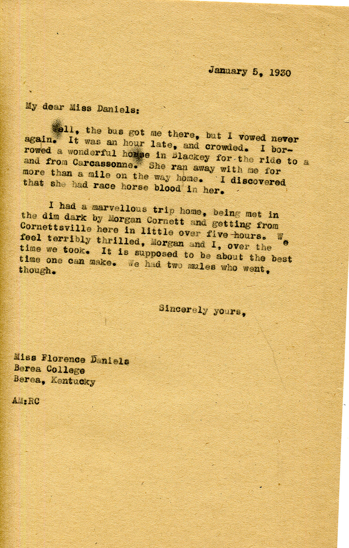 1. January 5. Angela Melville to Florence Daniels, who is at Berea, KY. Miss Melville says, “Well, the bus got me there [?where ], but I vowed never again. It was an hour late and crowded. I borrowed a wonderful horse in Blackey for the ride to and from Carcassone. She ran away with me for more than a mile on the way home. I discovered that she had racehorse blood in her.” Melville further describes the trip home: ” I had a marvelous trip home, being met in the dim dark by Morgan Cornett and getting from Cornettsville here in little over five hours. We fell terribly thrilled, Morgan and I, over the time we took. It is supposed to be about the best time one can make. We had two mules who went, though.”