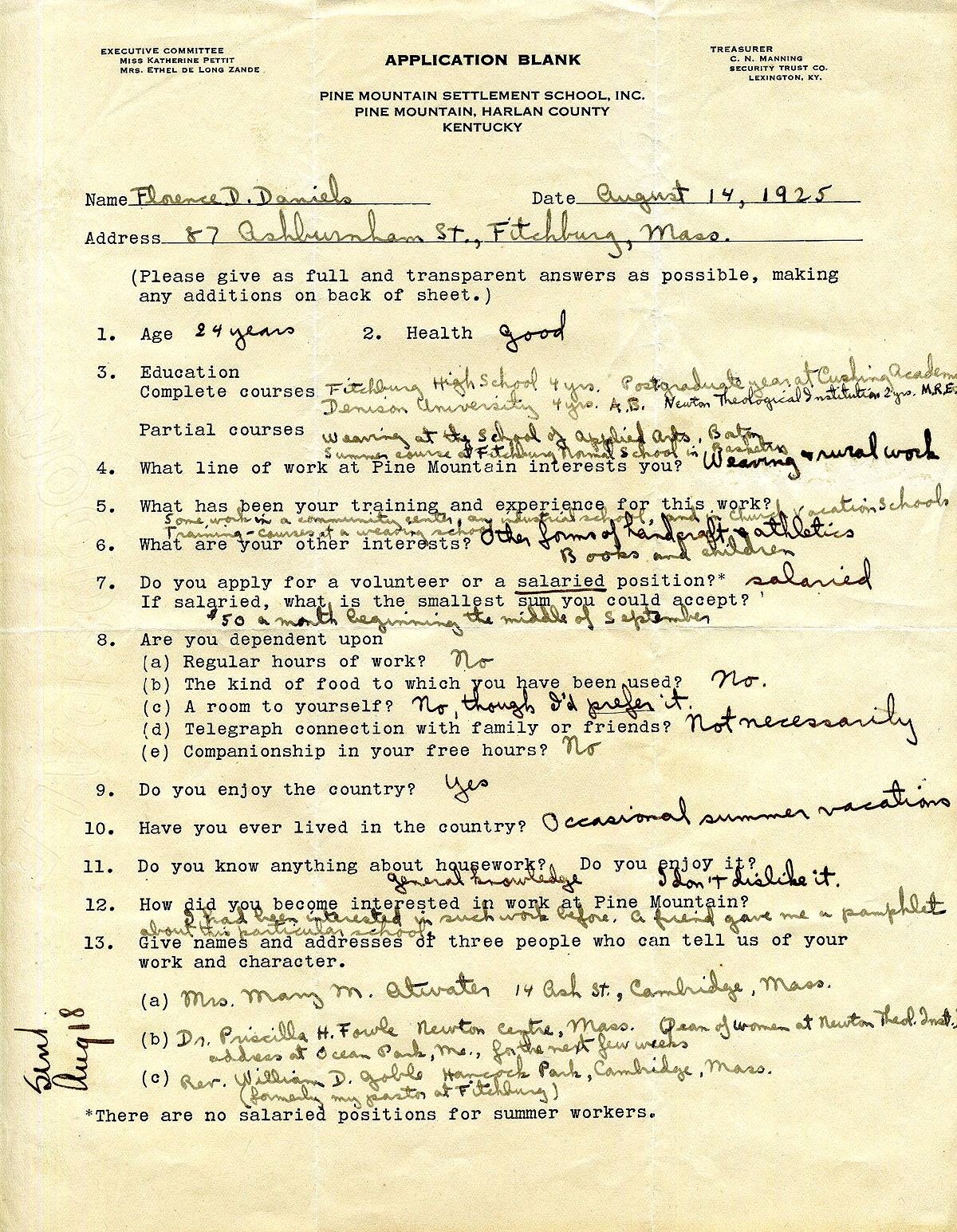 9. August 14. Letter from Florence Daniels to Katherine Pettit saying she is interested in working at Pine Mountain and asks many questions regarding the School, the looms, work, type of weavings, luggage, living accommodations, route of travel.