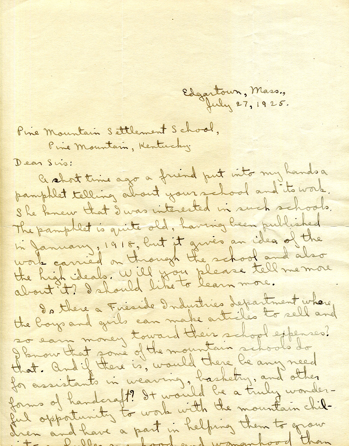 6. July 27. Letter of inquiry from Florence Daniels to Pine Mountain Settlement School, regarding programs and needs. She specifically asks about Fireside Industries programs and suggests she is interested in working with “mountain children…”. (2 pages)