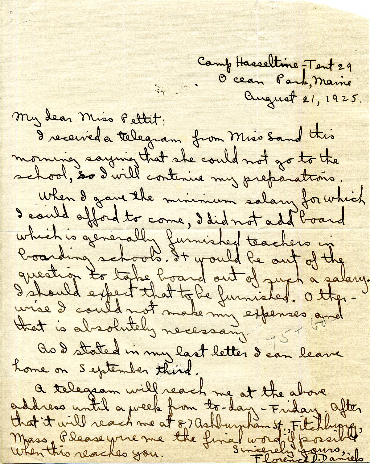 12. August 24. Florence Daniels to Katherine Pettit acknowledging the letter from Pettit that suggests that Miss Sands may come to PMSS and fill the position and that Daniels must wait until that is settled. Daniels says she will suspend her preparations but still wants a reply regarding salary. (2 pages)