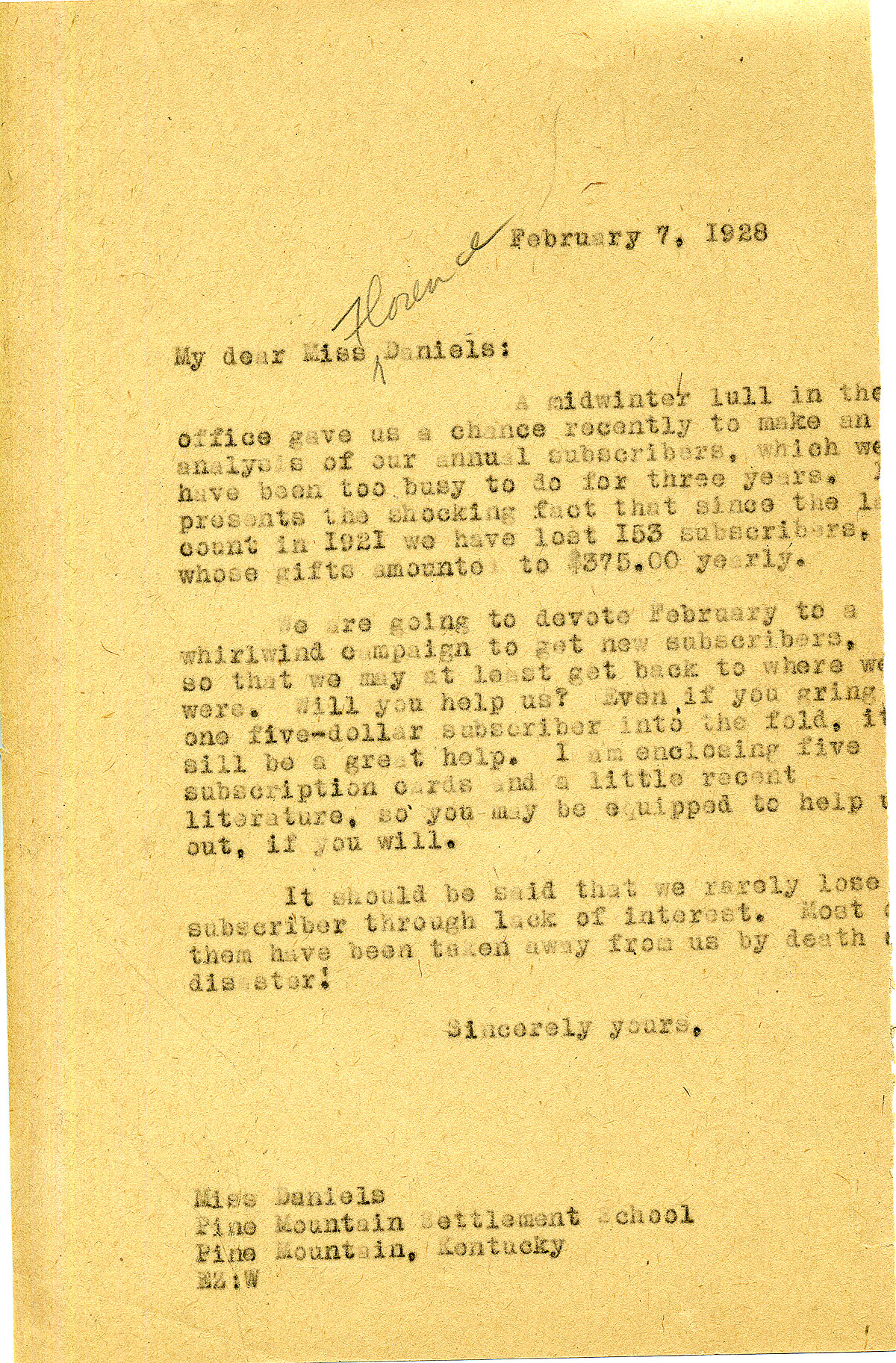 1. February 7. Ethel de Long Zande [?] to Florence Daniels alerting her and others of a February campaign to puck up subscribers to Pine Mountain’s declining donors. The letter describes a loss of 153 subscribers since the first recording of a list. The lost revenue amounts to $375.00 annually which the letter attributes to death and disaster. She alerts the reader that February will be devoted to a “whirlwind campaign to get new subscribers.” 5 subscribers cards were enclosed in the letter to Daniels to give to others.
