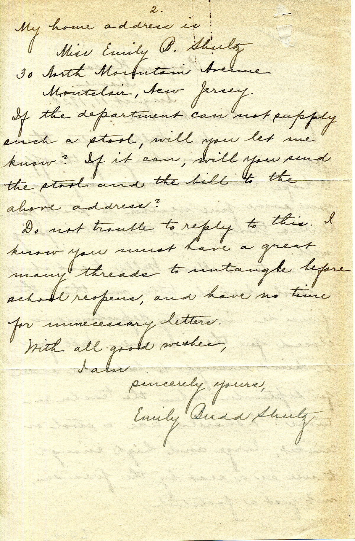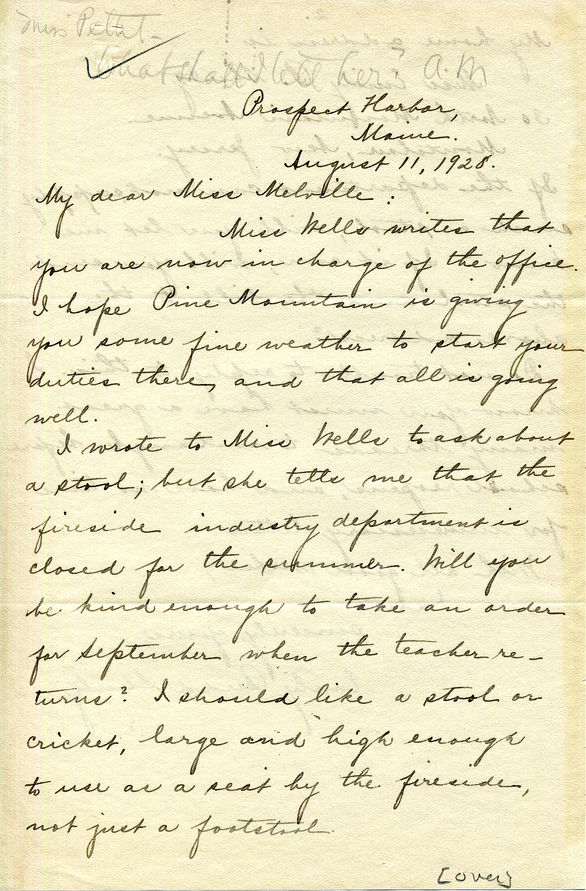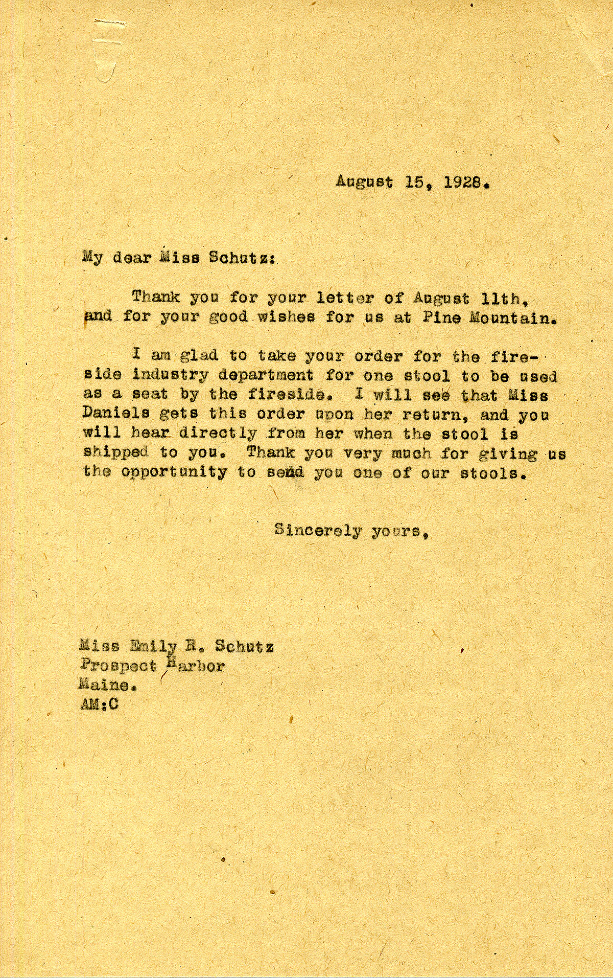 3. August 11. Emily R. Shutz to Angela Melville. Emily welcomes Melville to Pine Mountain and ask to purchase a stool or “cricket” “large and high enough to use as a seat by the fireside…” from the Fireside Industries for September. (2 pages)