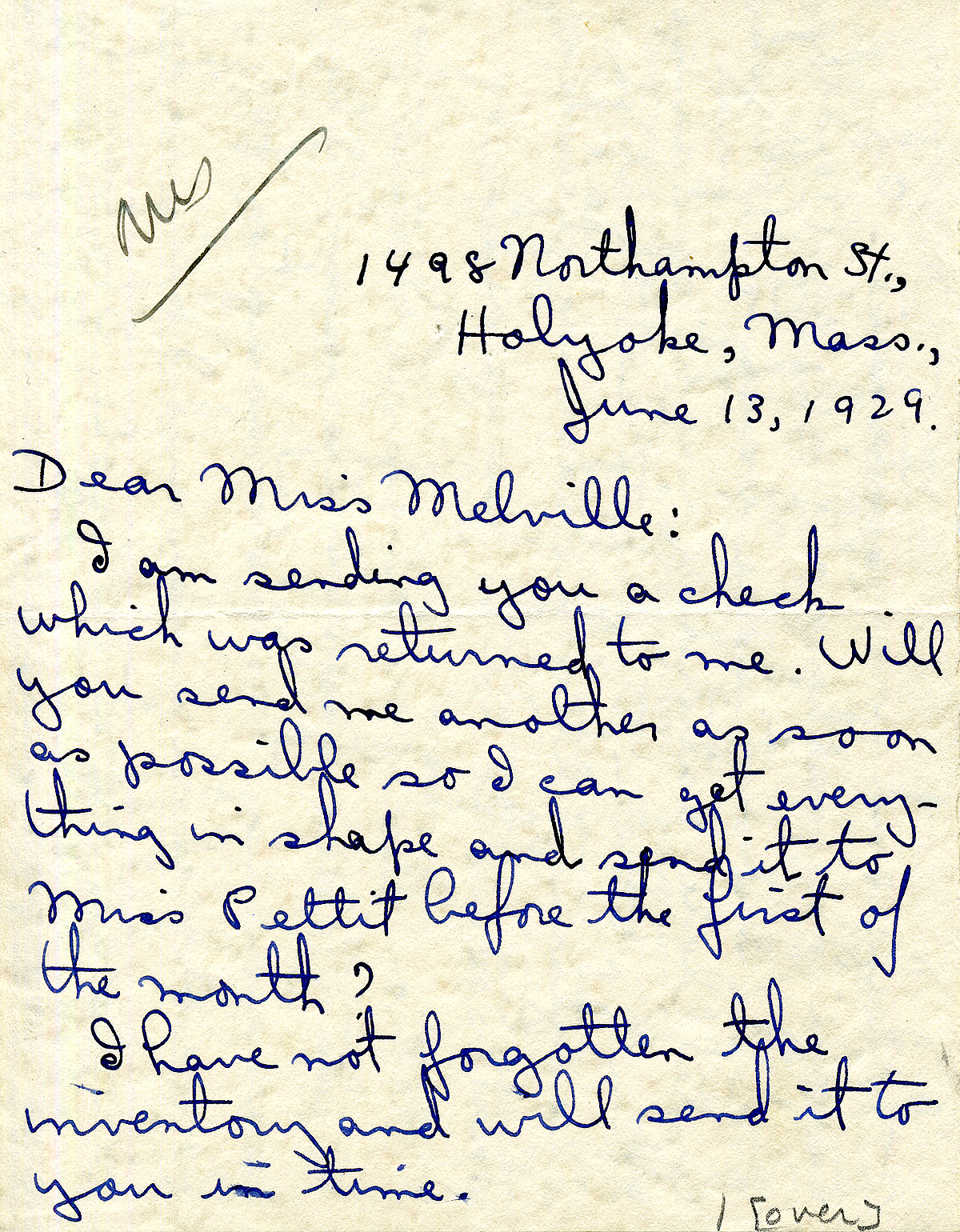 1. June 13. Letter from Florence Daniels to Miss Angela Melville, from her home in Holyoke, Mass. Correspondence regarding a returned check and an inventory. Daniels describes a trip to Berea with Miss Welty and a wedding in Boston. Daniels says she has been asked to speak at an event in Mt. Holyoke.
