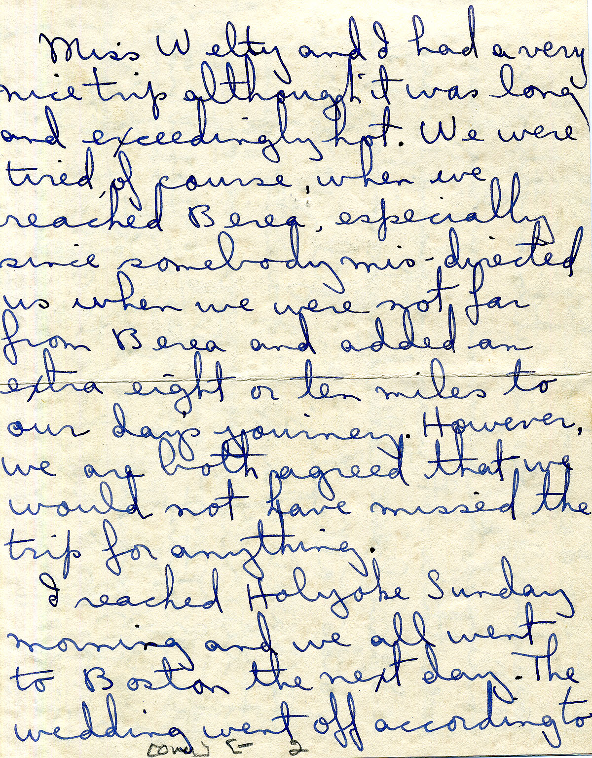 1. June 21. Florence Daniels to Ethel de Long Zande. Daniels describes driving with Miss Halliday and her father to Abingdon, VA where she caught a sleeper to NYC to visit her brother. She tells of good interest in Pine Mountain Settlement School and notes that the pictures from Miss Wulf were “…nice to show”. A Post Script notes a visit with Miss Van Bezey and Miss Hughes who told her of the upcoming trip of Zande to Smith for her reunion. (3 pages)